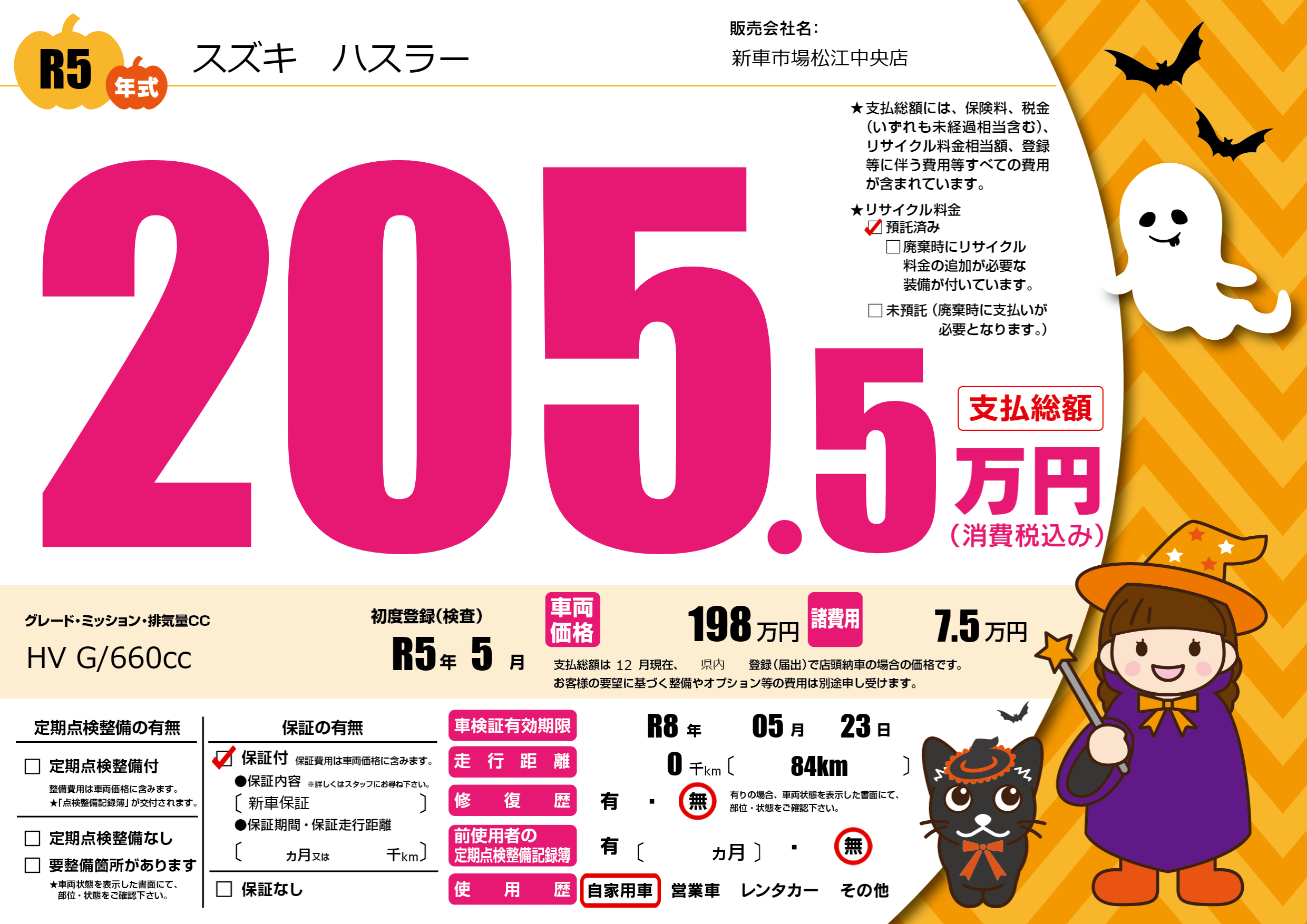 | 車名 | スズキ ハスラー | グレード ミッション 排気量 |