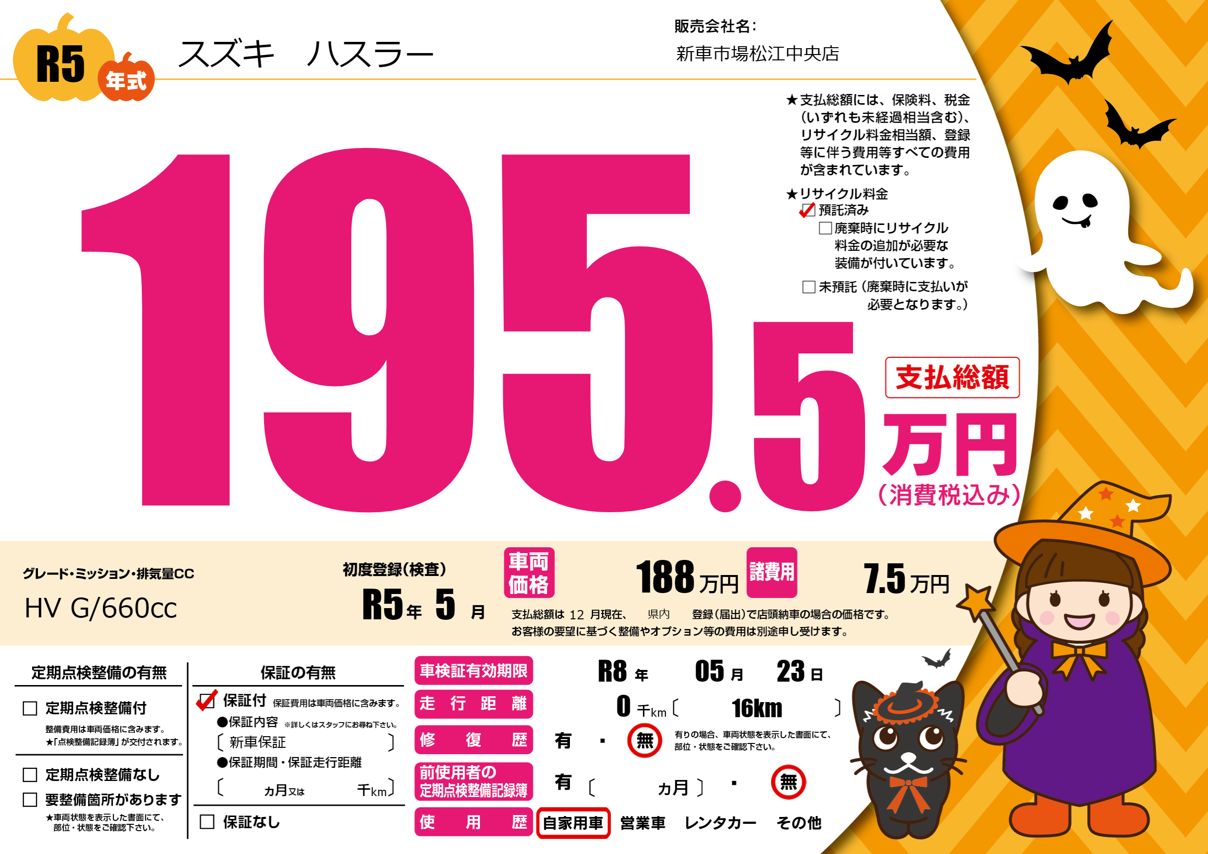 | 車名 | スズキ ハスラー | グレード ミッション 排気量 |