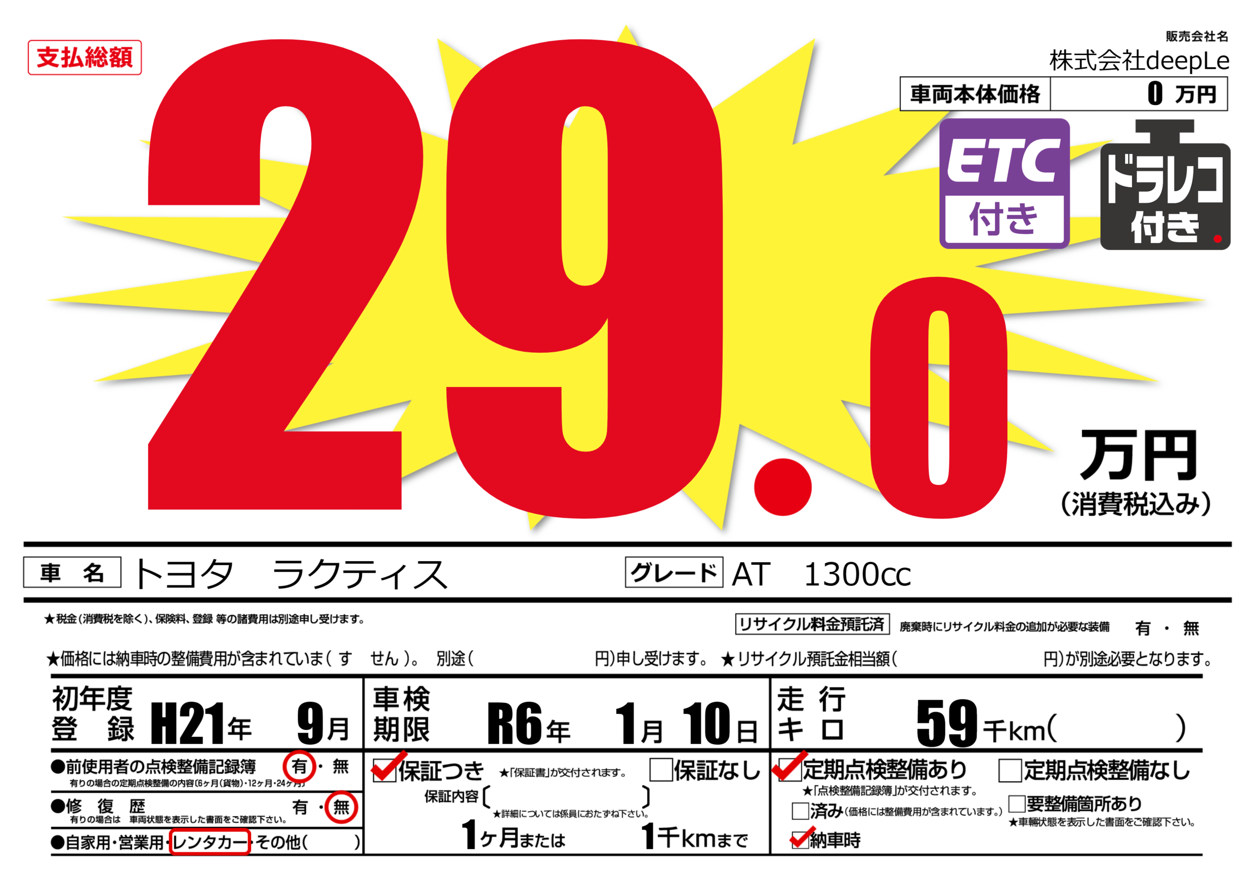 | 車名 | トヨタ ラクティス | グレード ミッション 排気量 |