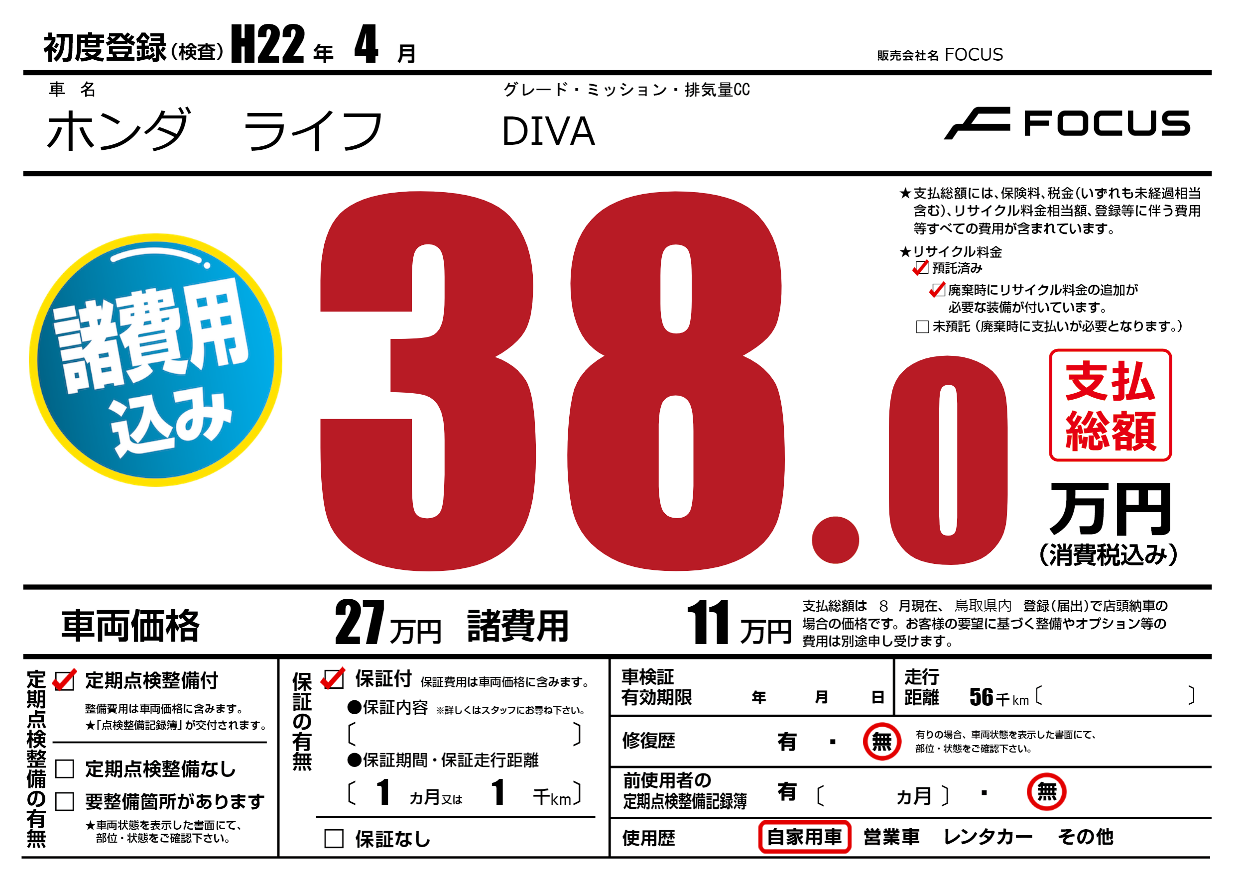 | 車名 | ホンダ ライフ | グレード ミッション 排気量 |