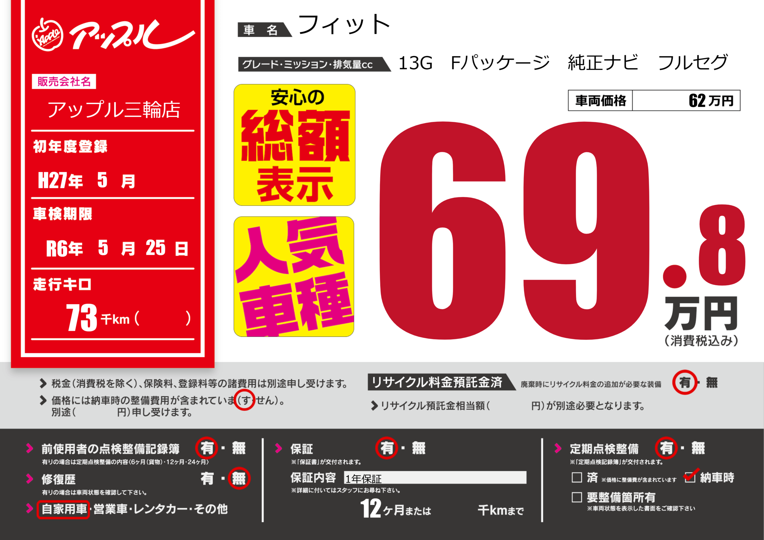 保証付き 保証内容(1年保証) 12ヶ月または()千kmまで |