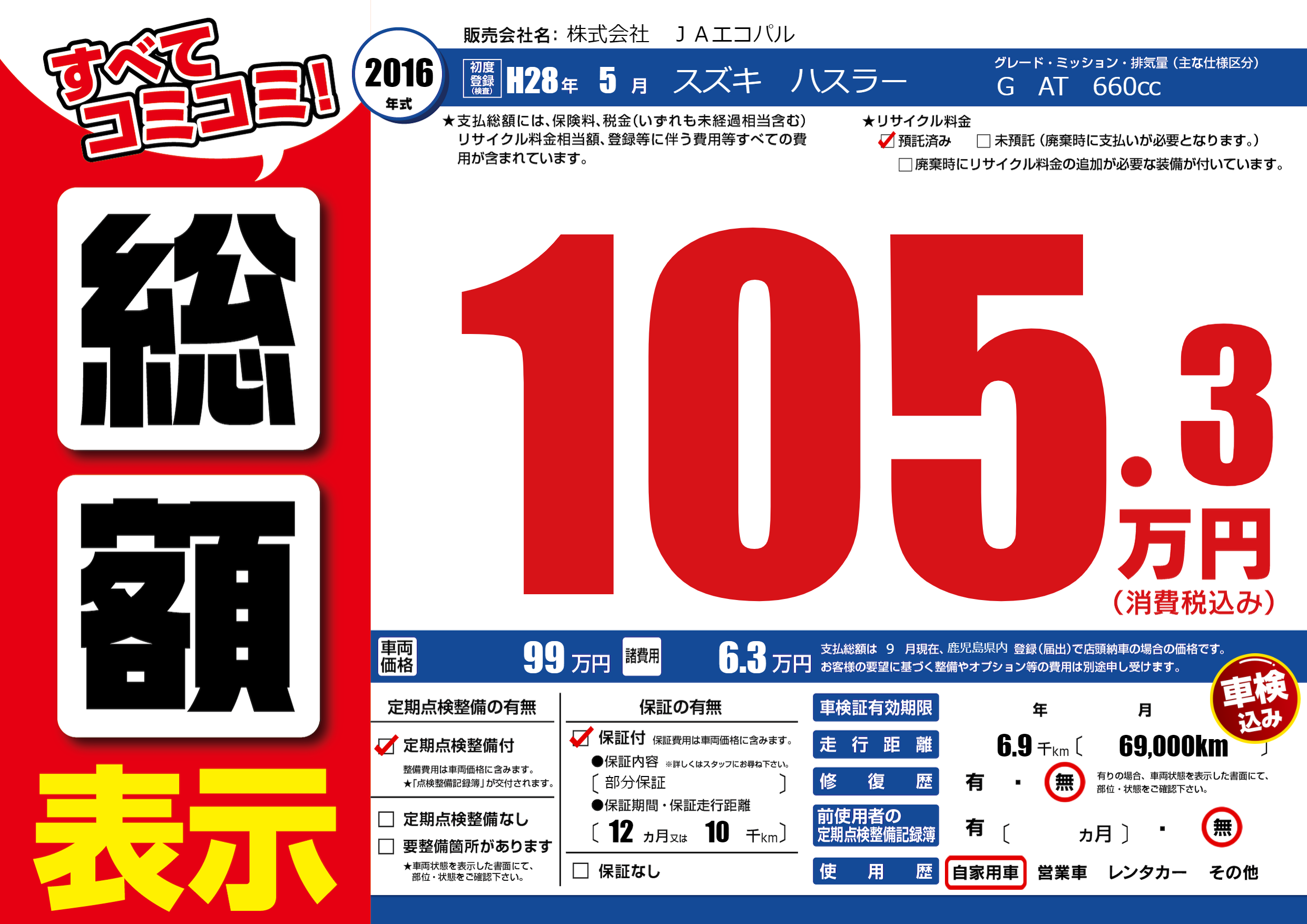 | 車名 | スズキ ハスラー | グレード ミッション 排気量 |