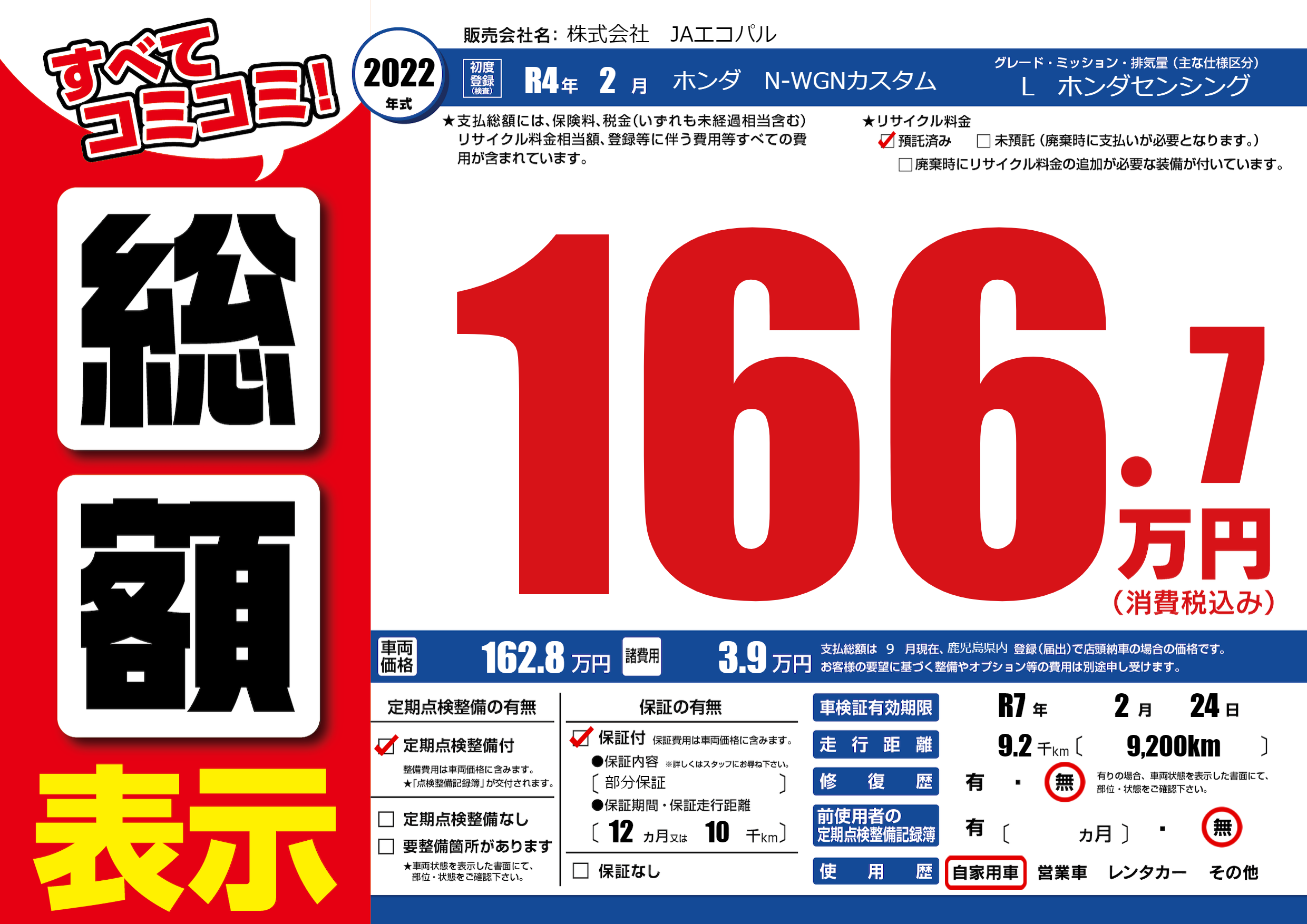 | 車名 | ホンダ N-WGNカスタム | グレード ミッション 排気量 |