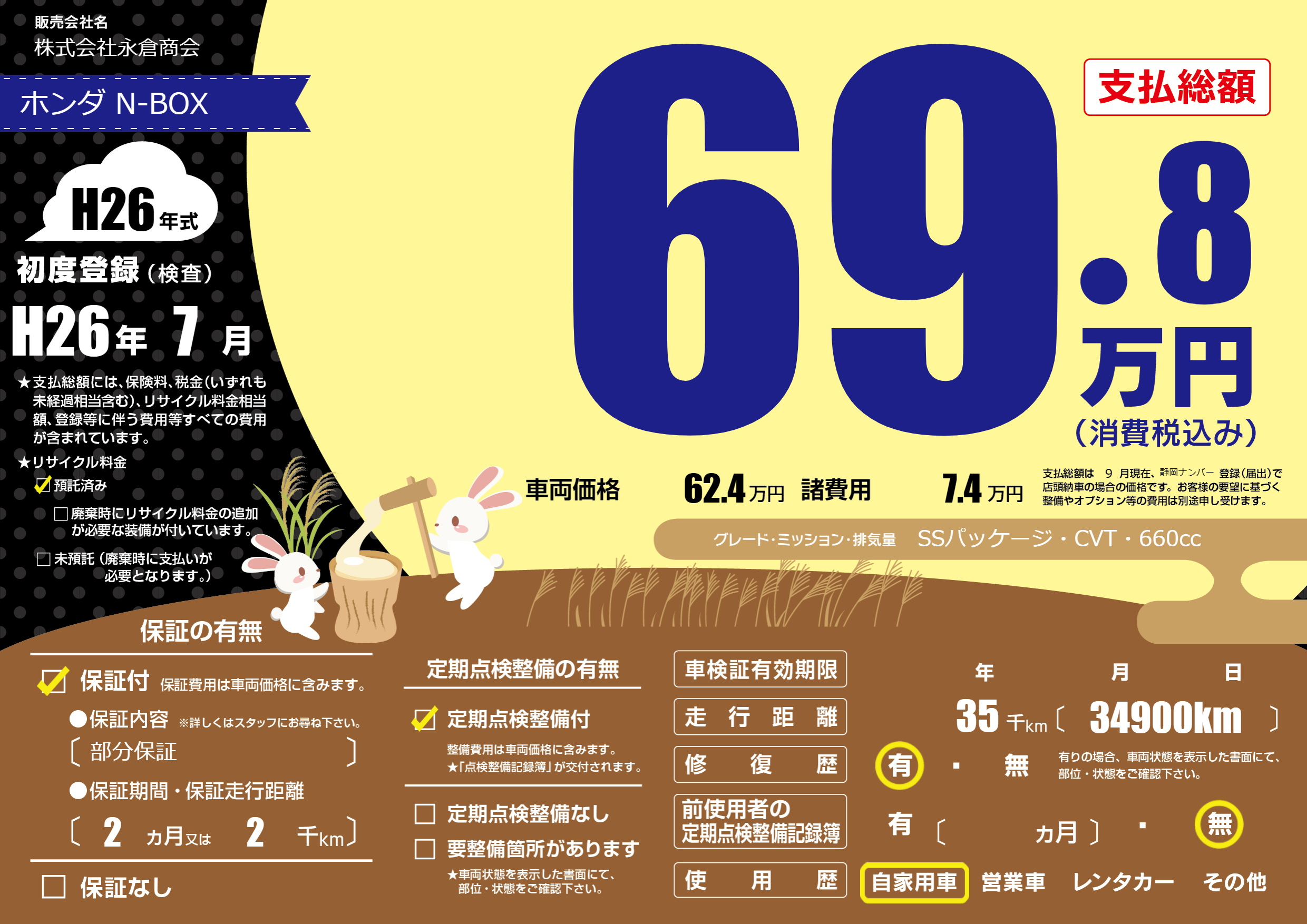 | 車名 | ホンダ N-BOX | グレード ミッション 排気量 |