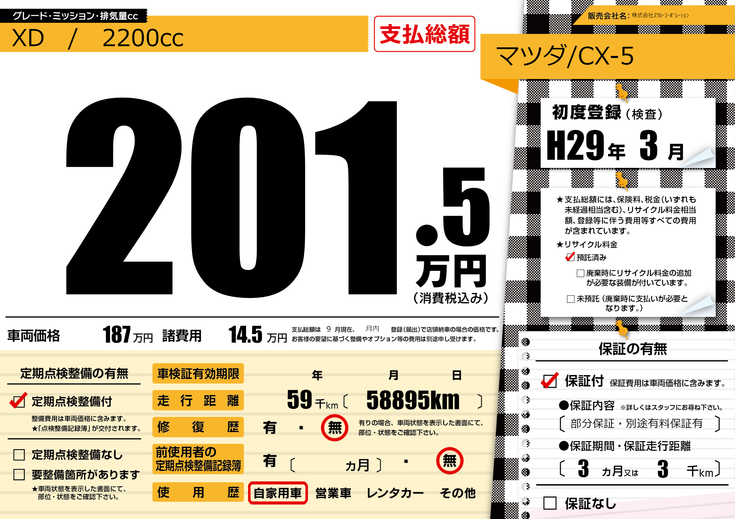 | 車名 | マツダ/CX-5 | グレード ミッション 排気量 |