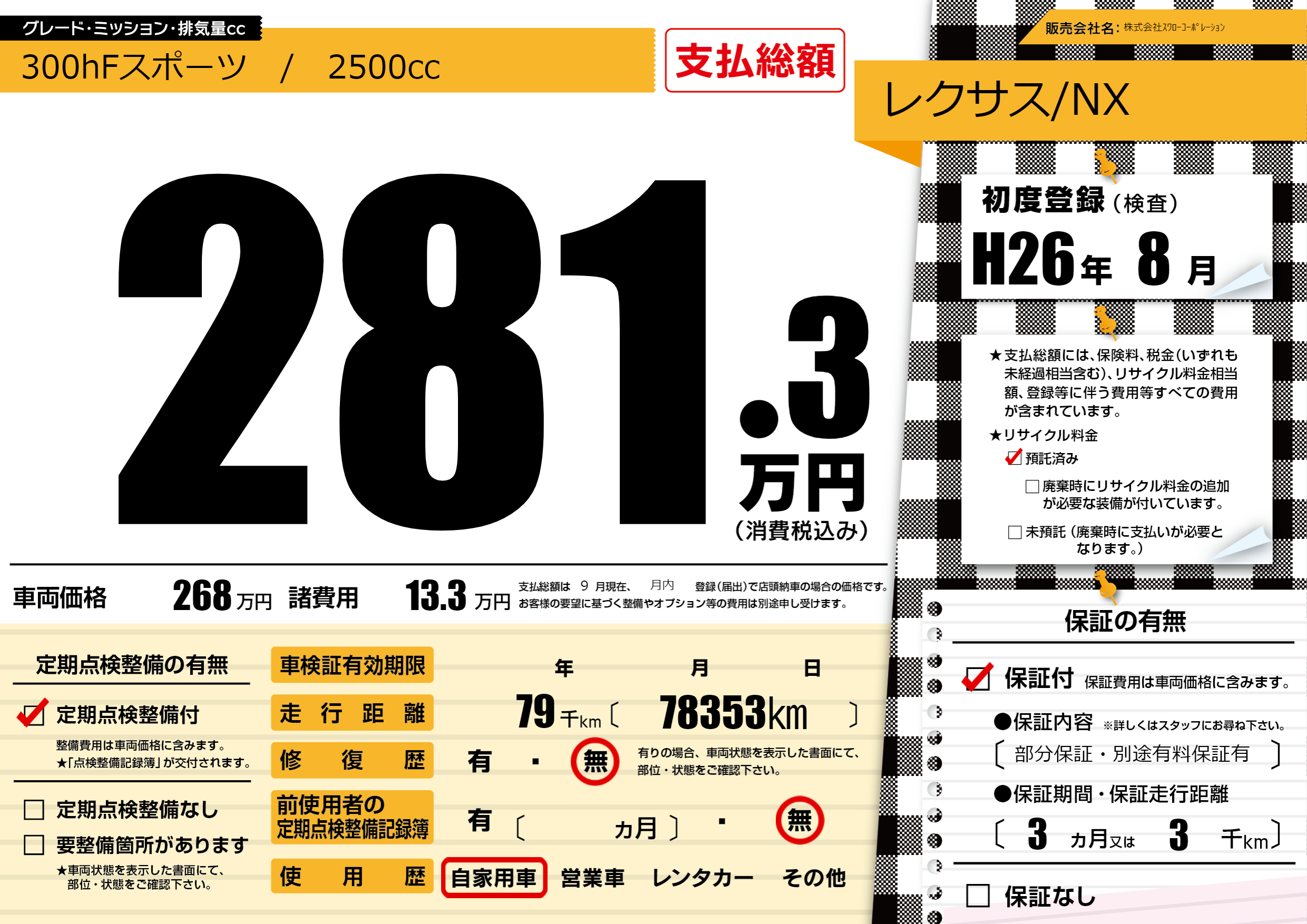 保証付き 保証内容(部分保証・別途有料保証有) 3ヶ月または(3)千kmまで |