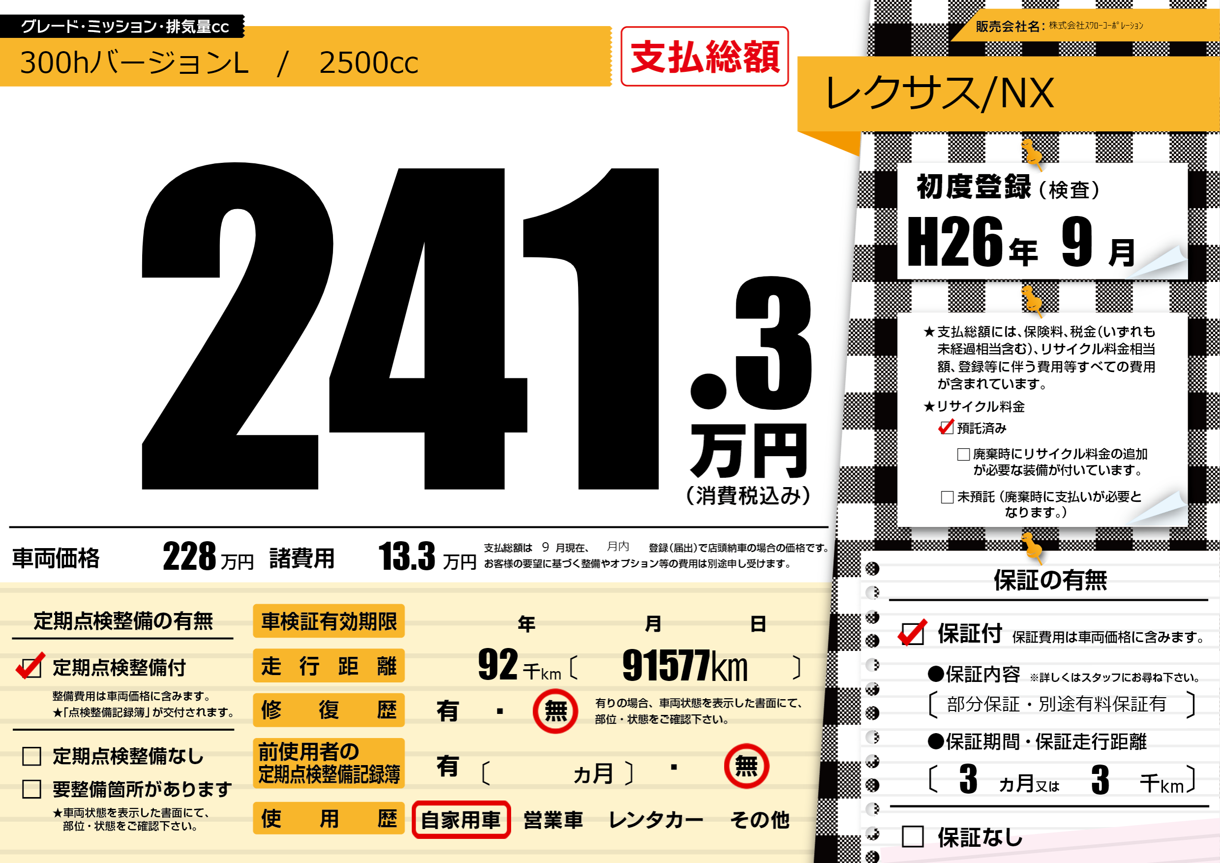 | 車名 | レクサス/NX | グレード ミッション 排気量 |