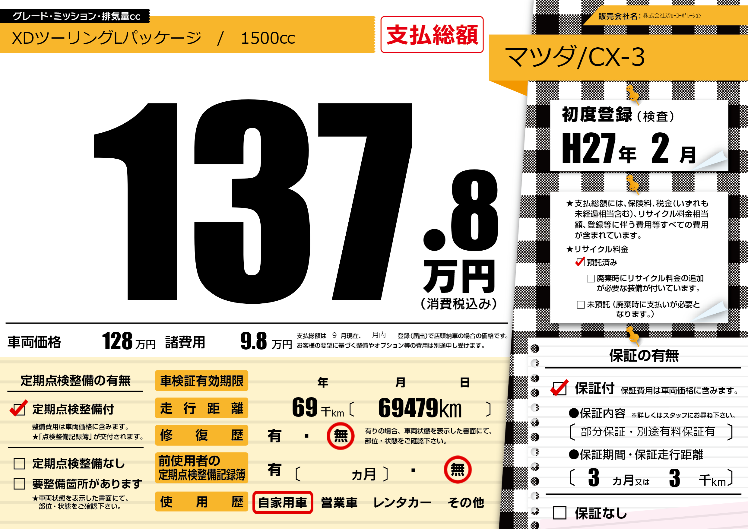 | 車名 | マツダ/CX-3 | グレード ミッション 排気量 |