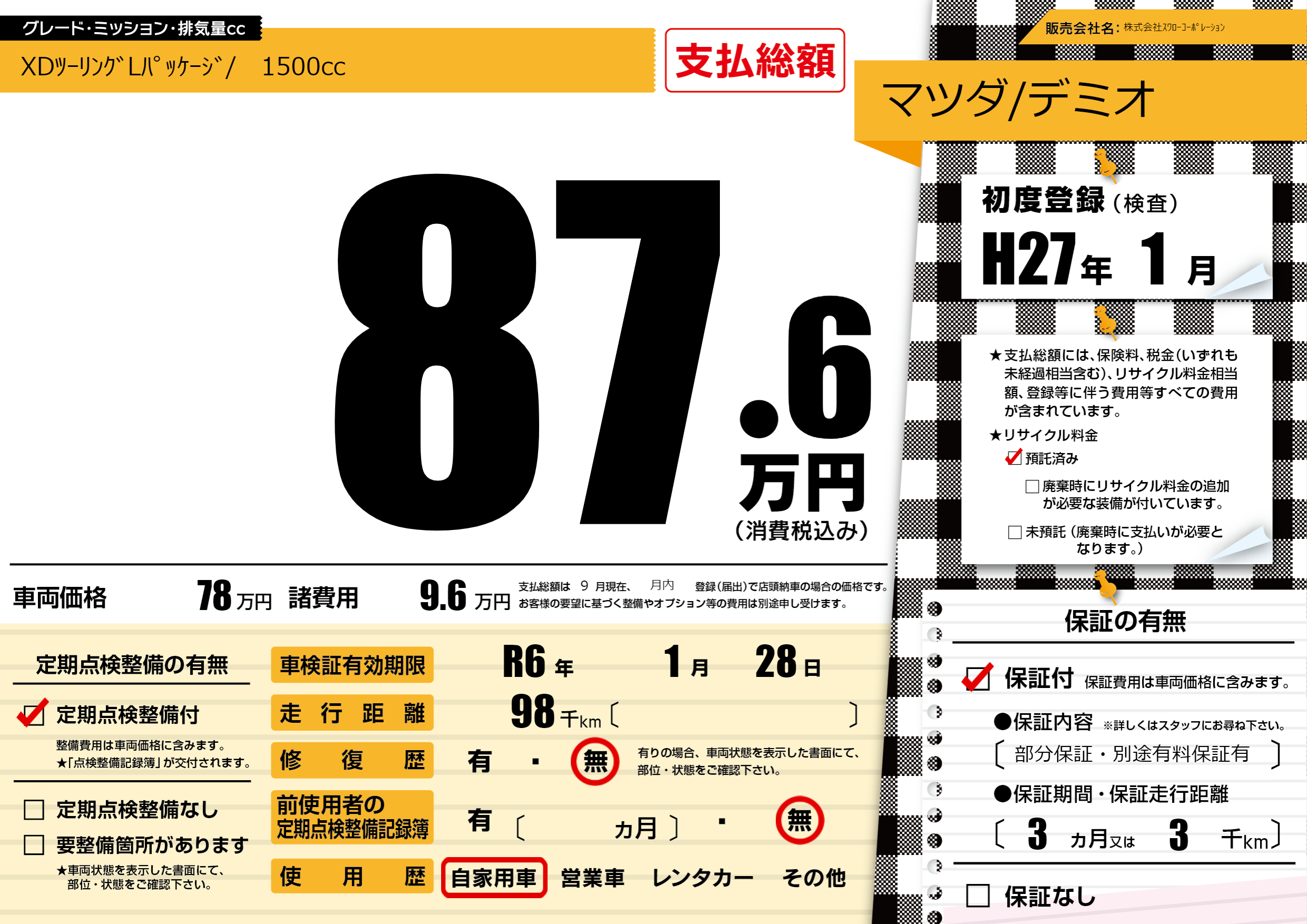 | 車名 | マツダ/デミオ | グレード ミッション 排気量 |