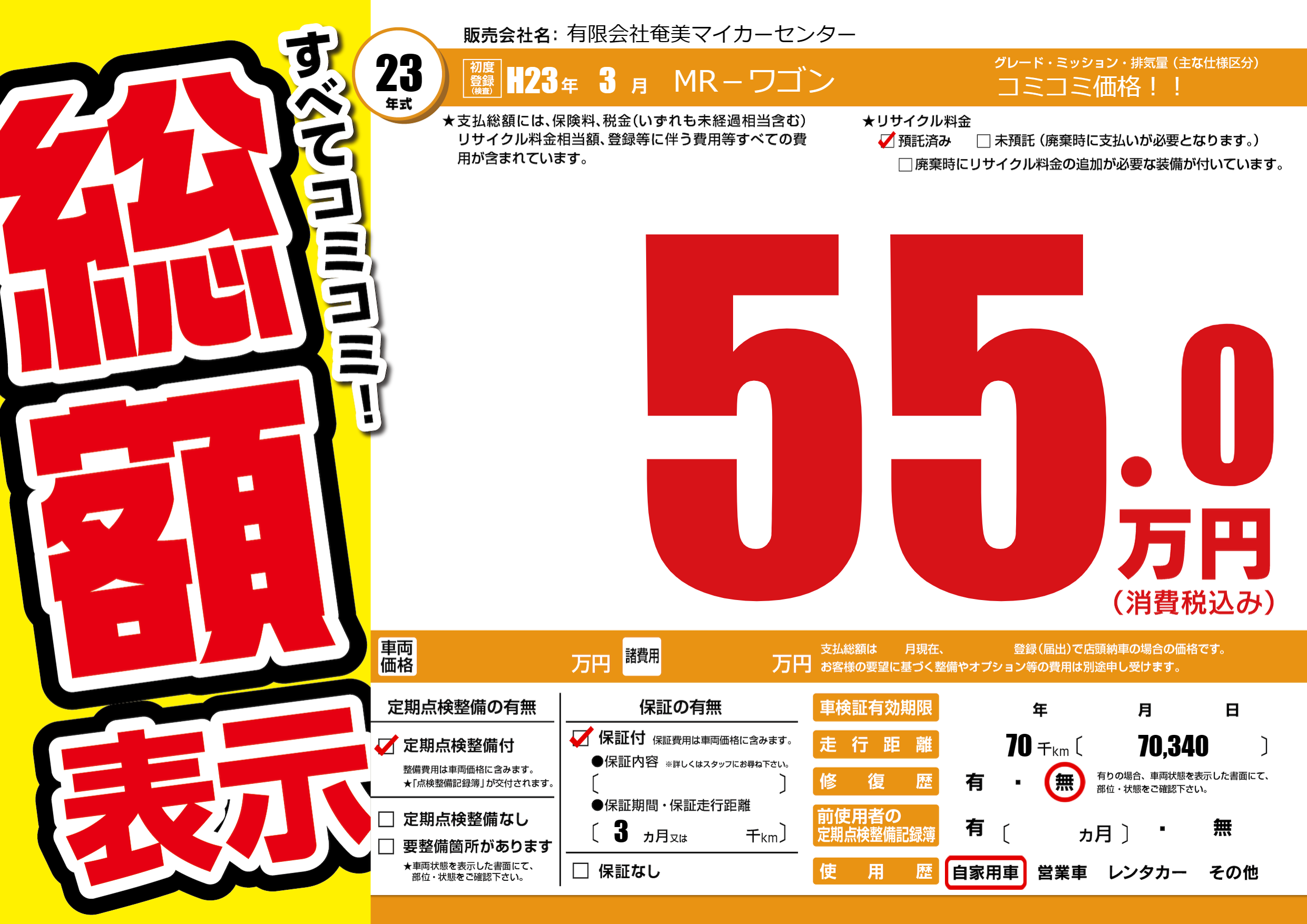 | 走行キロ | 7万km | 初年度登録 | H23年3月 |