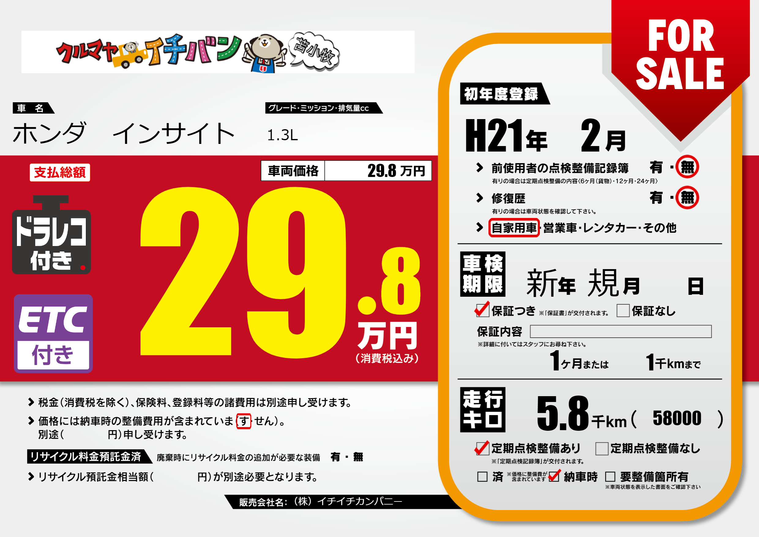 | 車名 | ホンダ インサイト | グレード ミッション 排気量 |