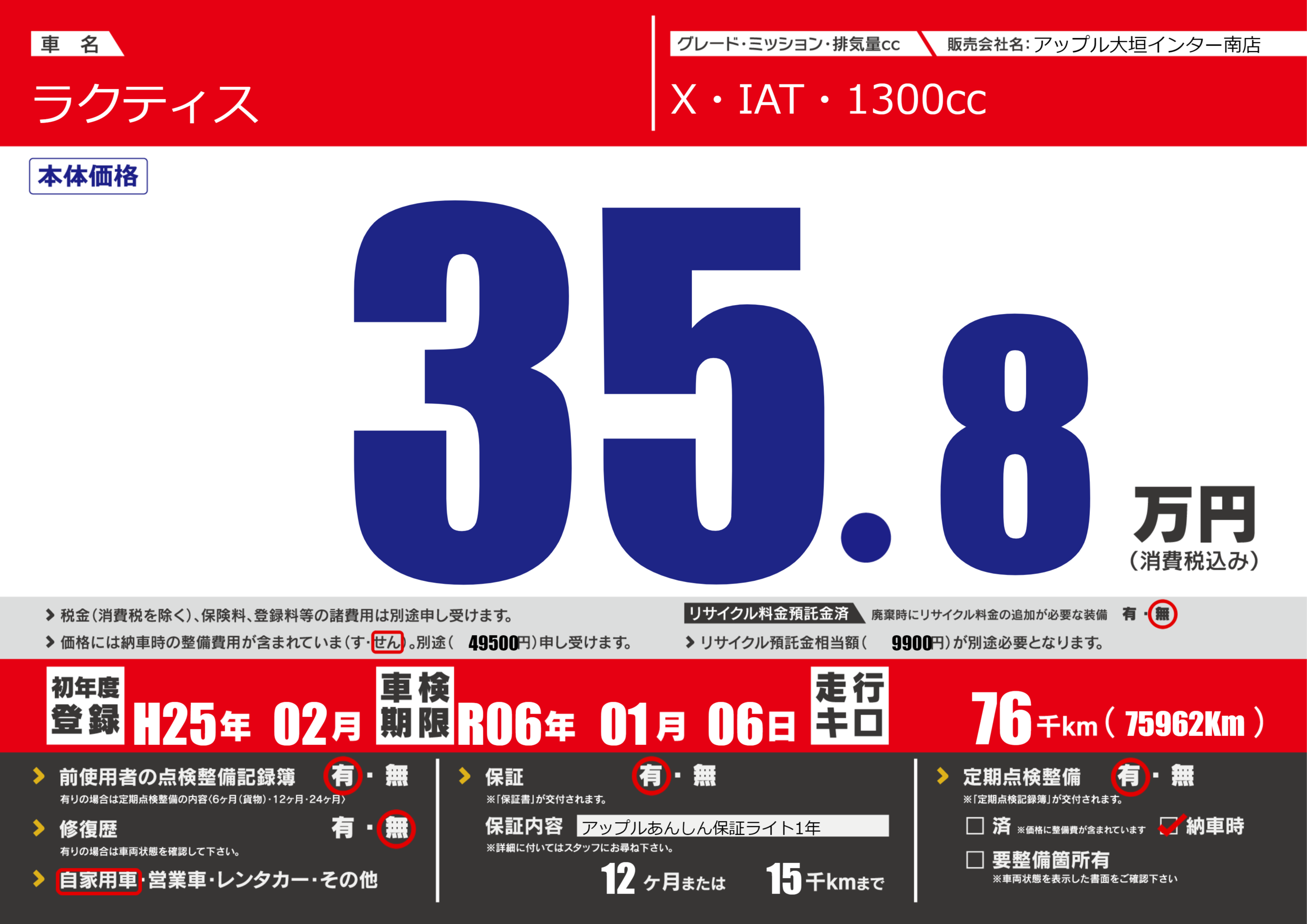 | 走行キロ | 7.6万km | 初年度登録 | H25年02月 |