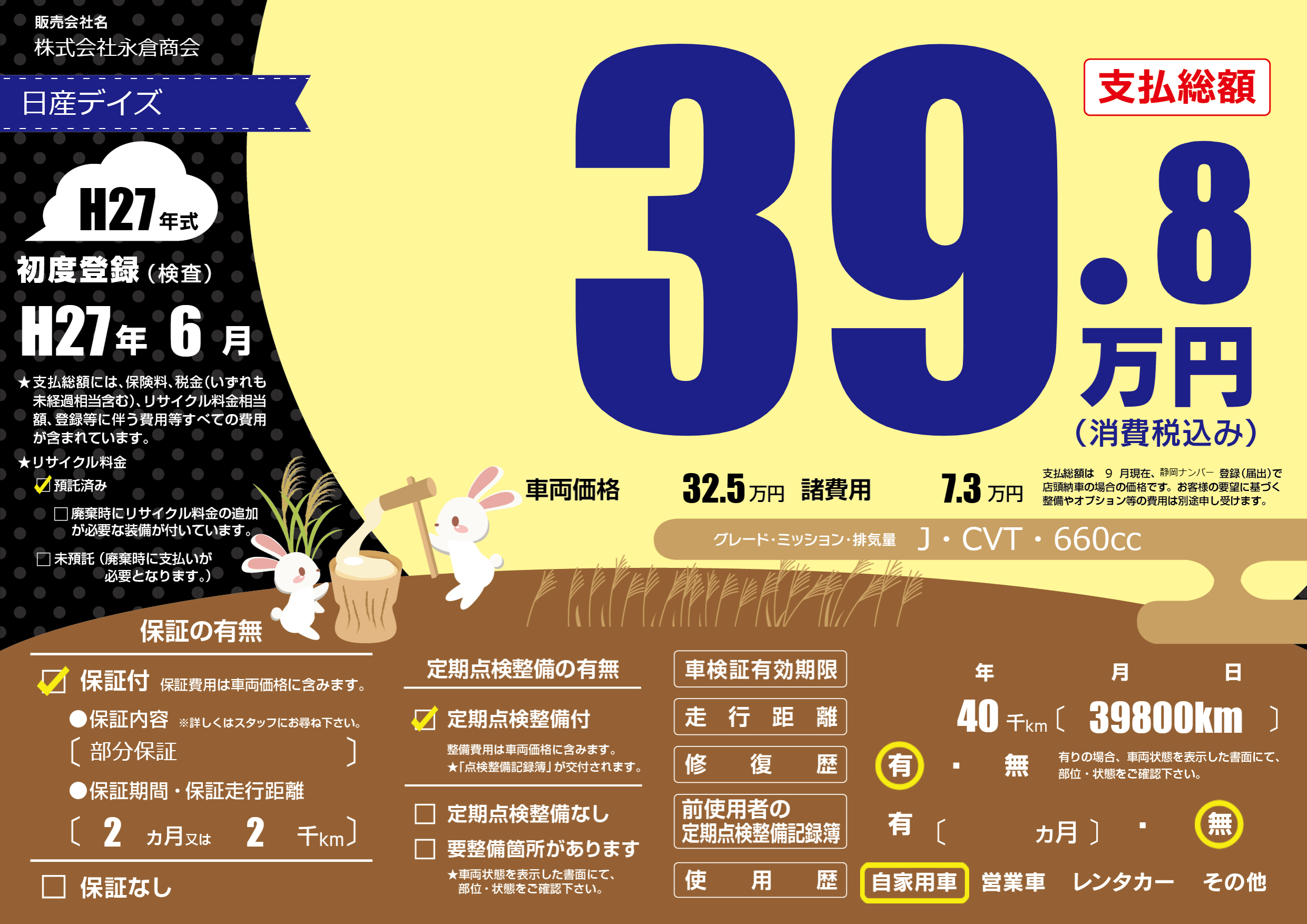 | 走行キロ | 4万km | 初年度登録 | H27年6月 |
