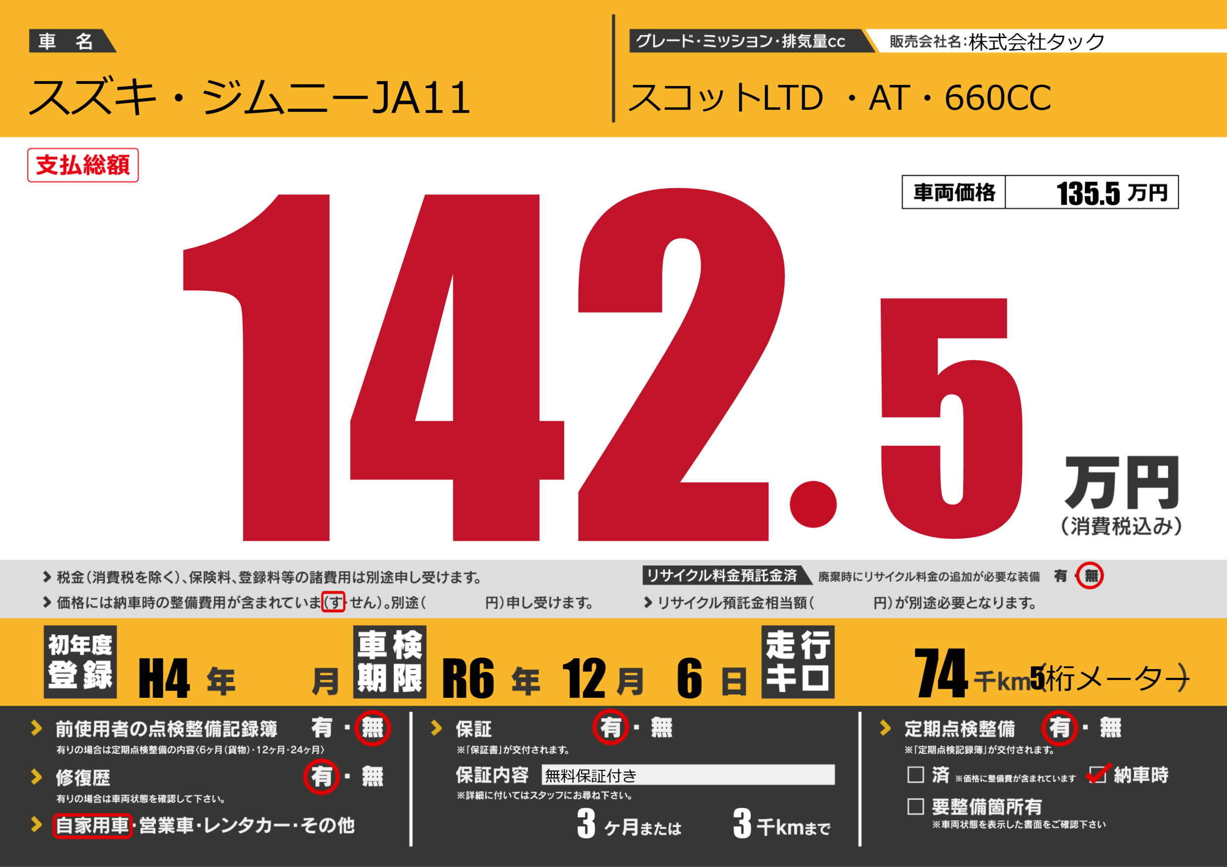 | 車検制限 | R6年 12月 6日 | ||
