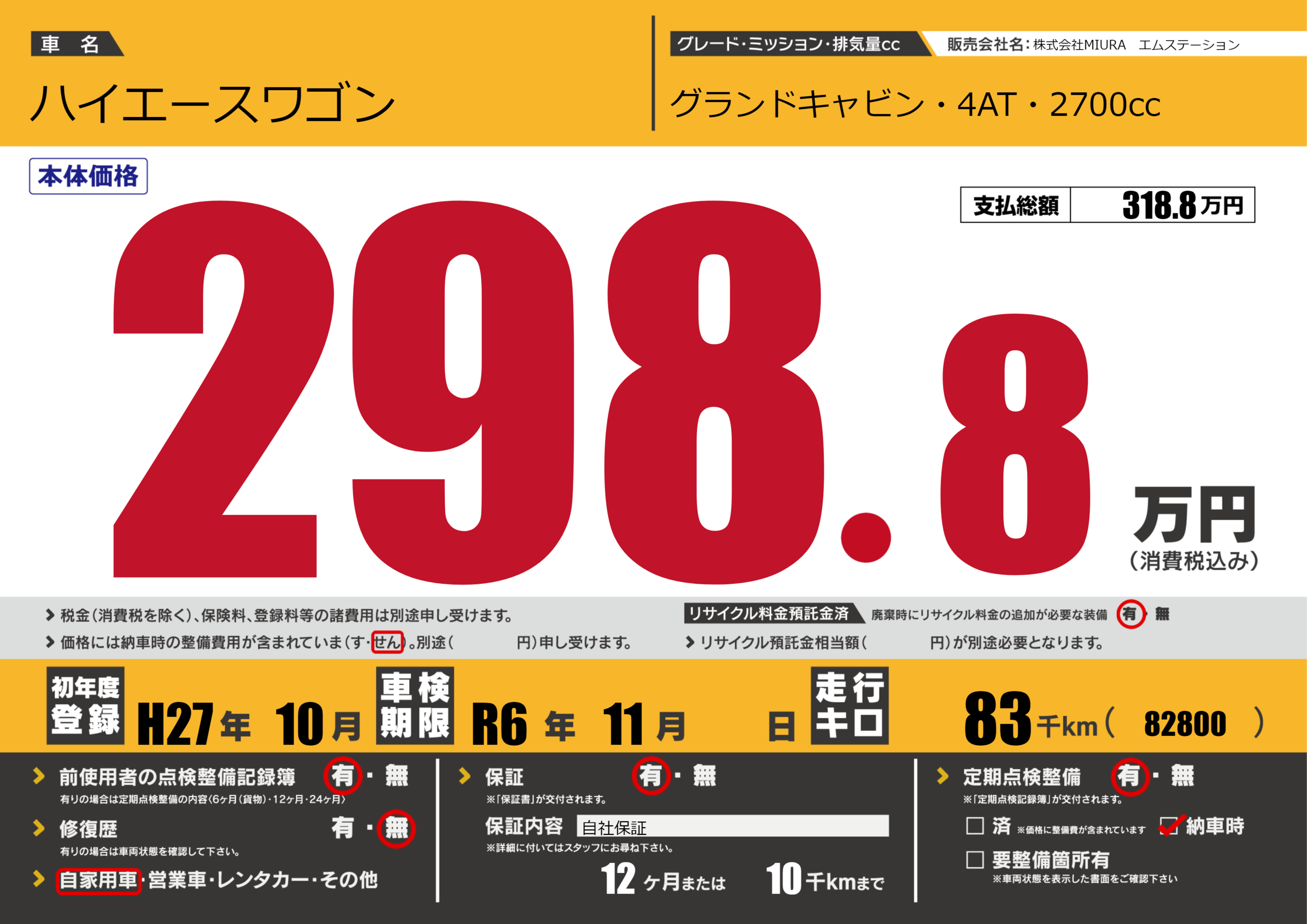 | 車名 | ハイエースワゴン | グレード ミッション 排気量 |
