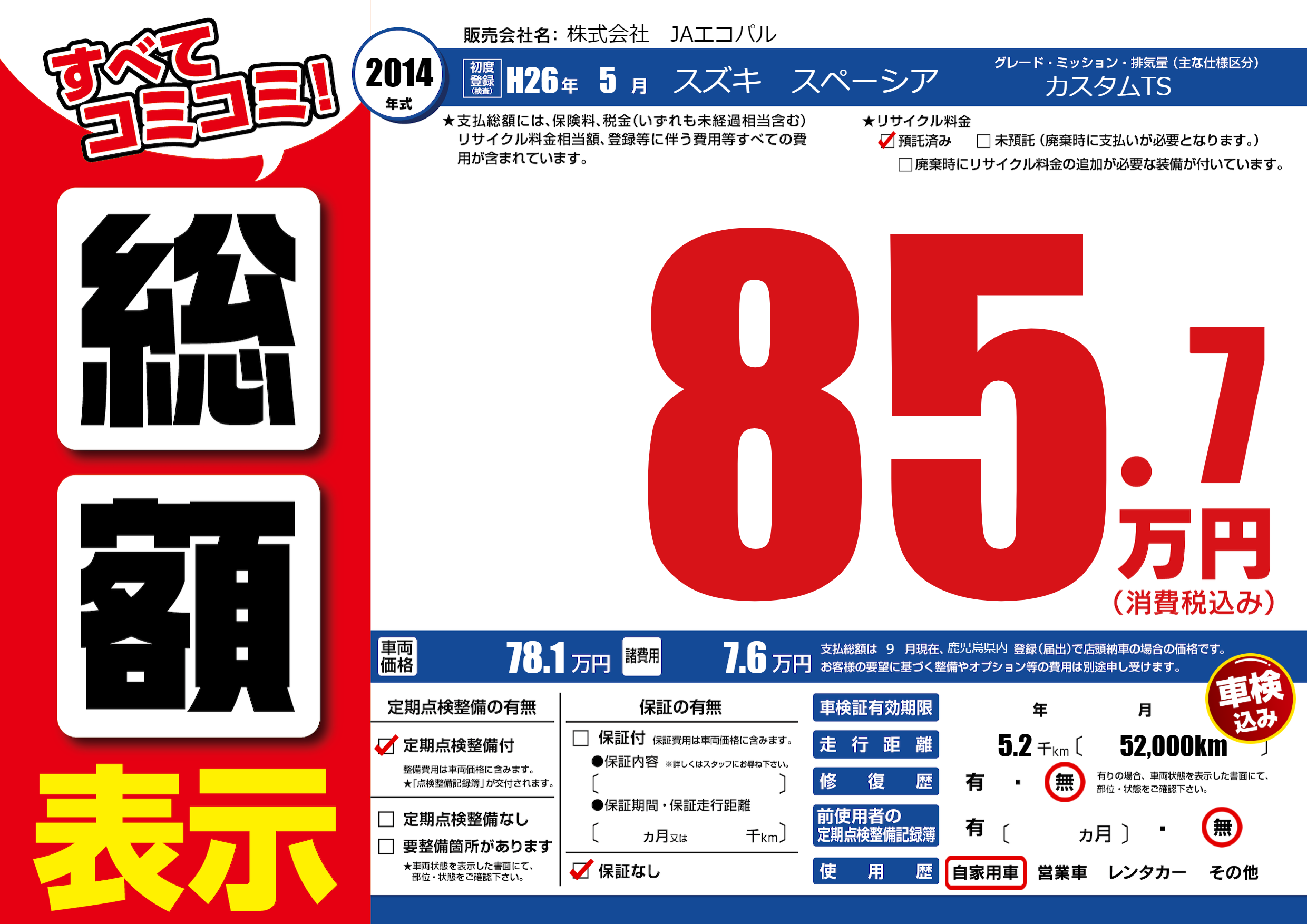 | 走行キロ | 0.5万km | 初年度登録 | H26年5月 |