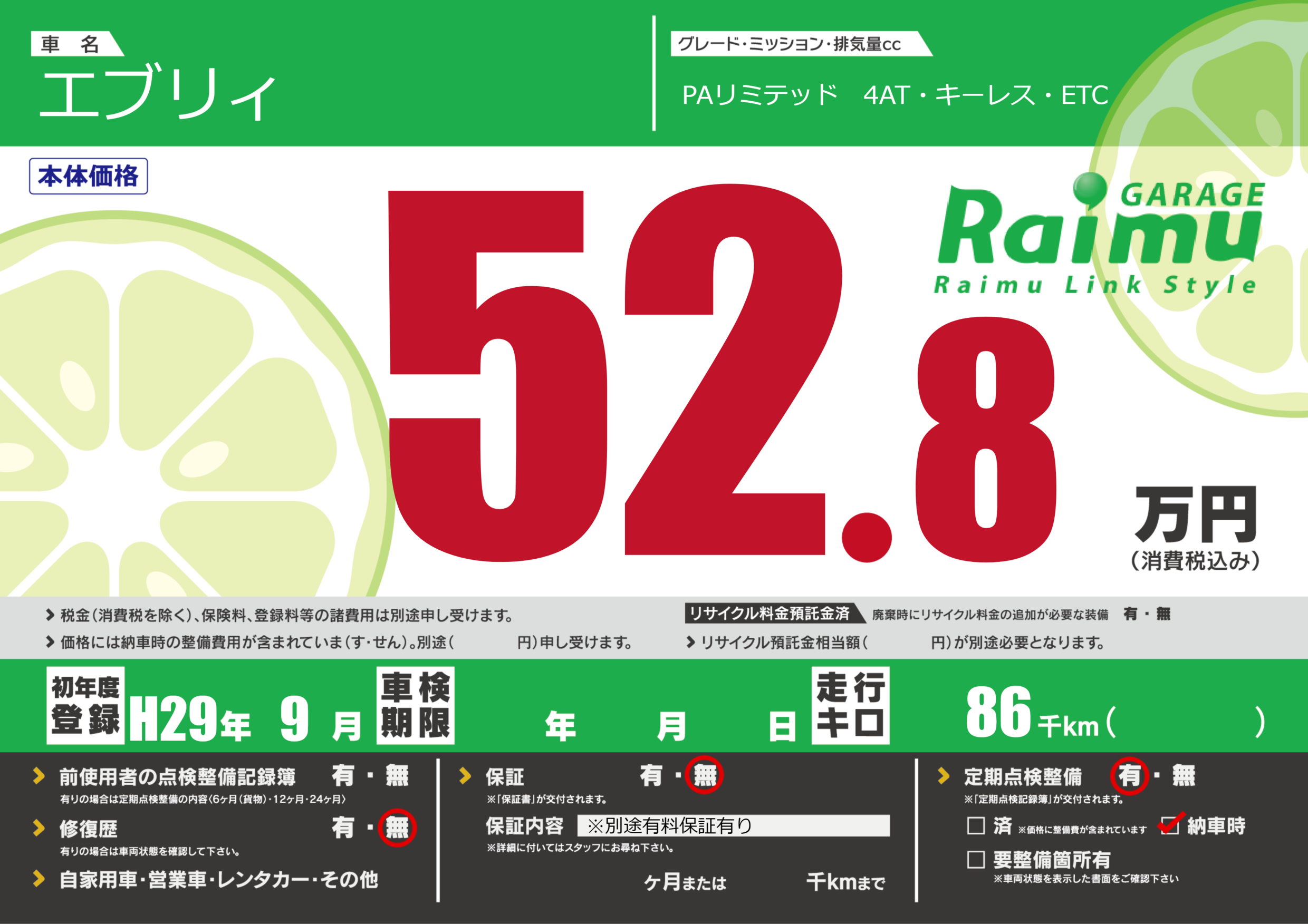 | 車名 | エブリィ | グレード ミッション 排気量 |