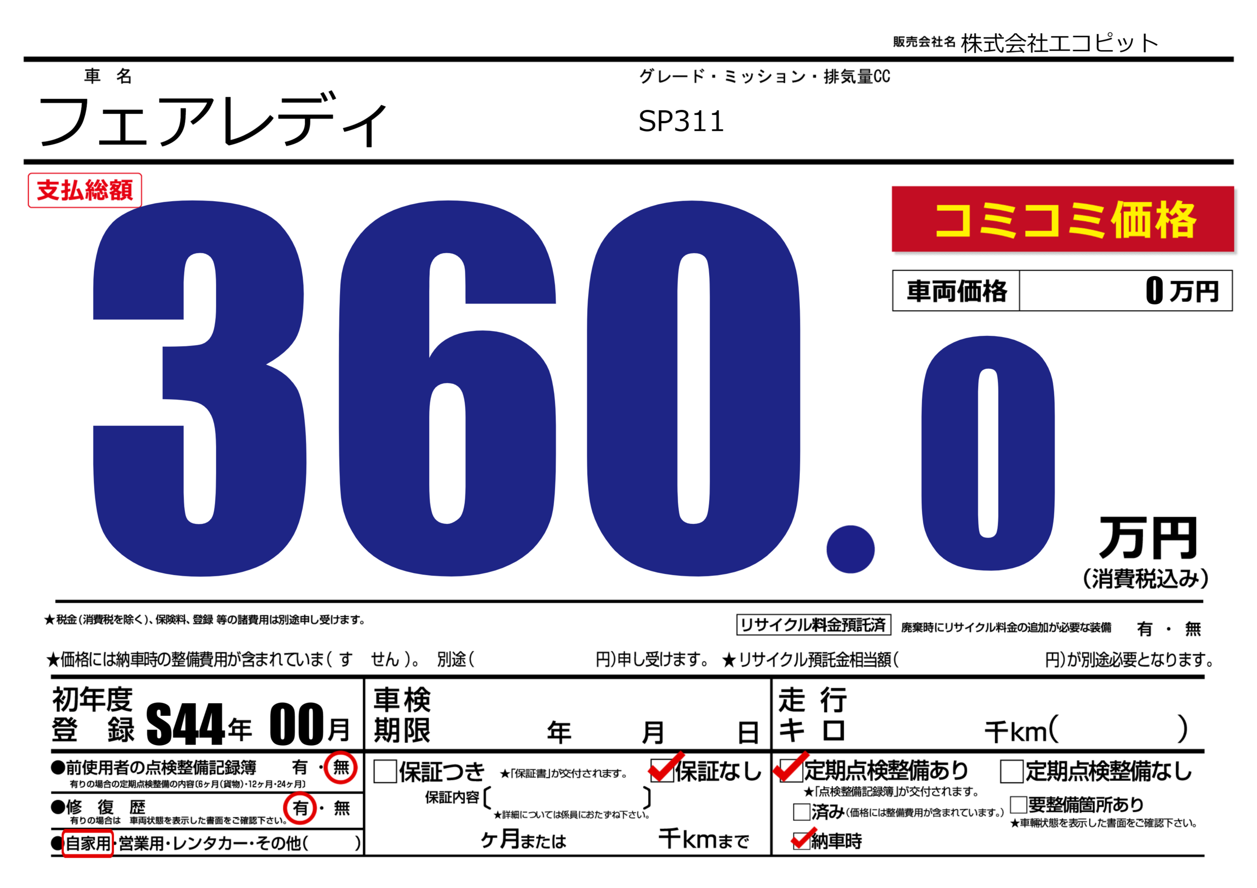 | 定期点検整備 | 定期点検整備あり 納車時あり | ||