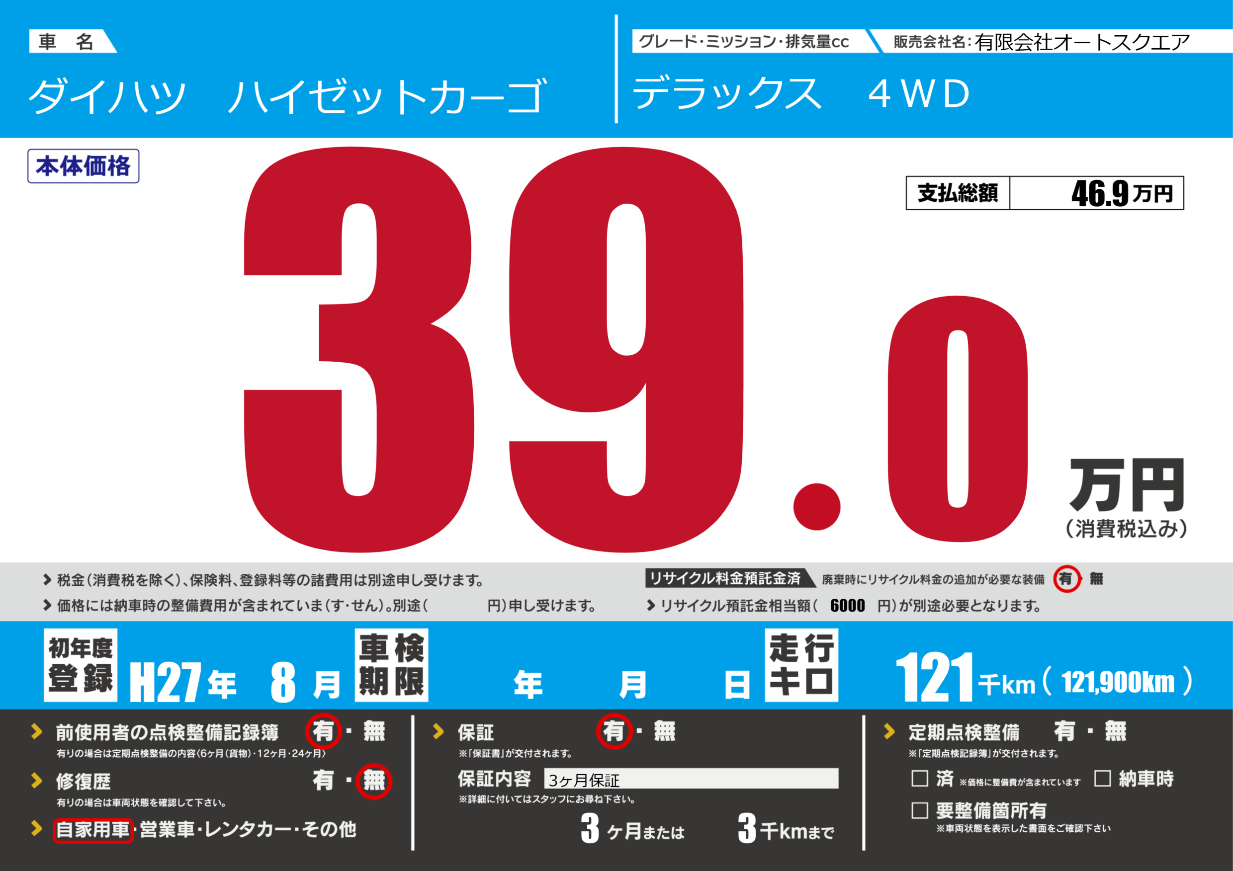 | 車名 | ダイハツ ハイゼットカーゴ | グレード ミッション 排気量 |