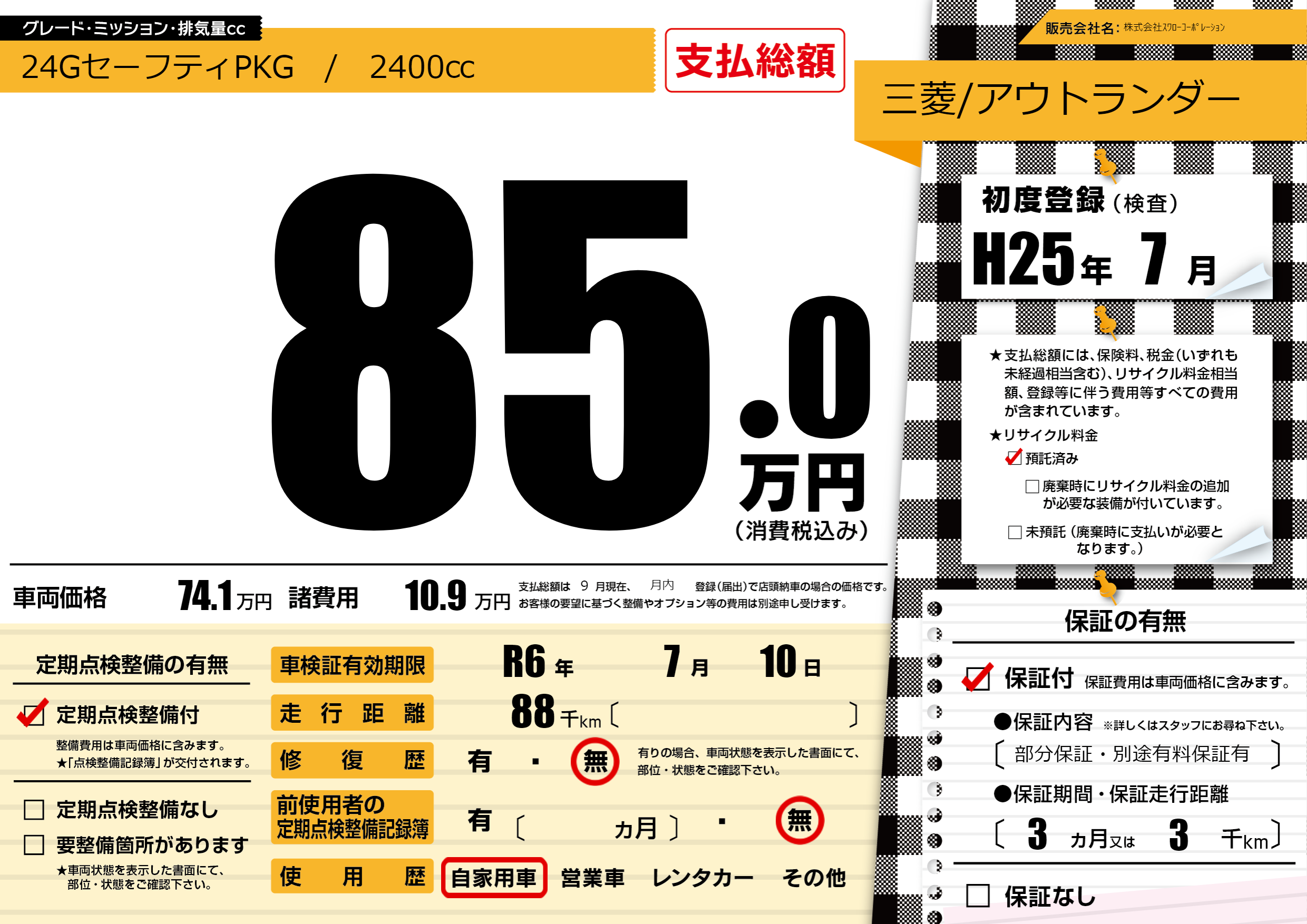| 車名 | 三菱/アウトランダー | グレード ミッション 排気量 |