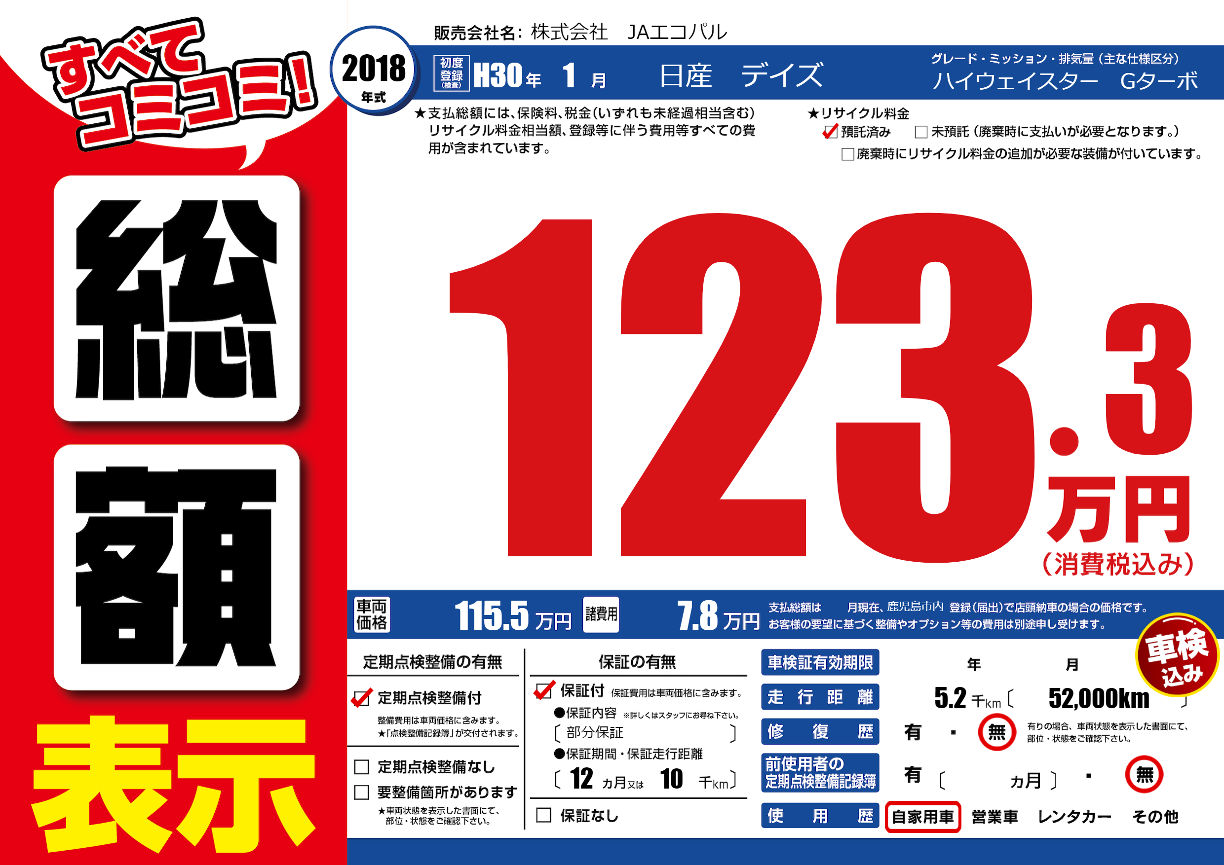 | 車名 | 日産 デイズ | グレード ミッション 排気量 |