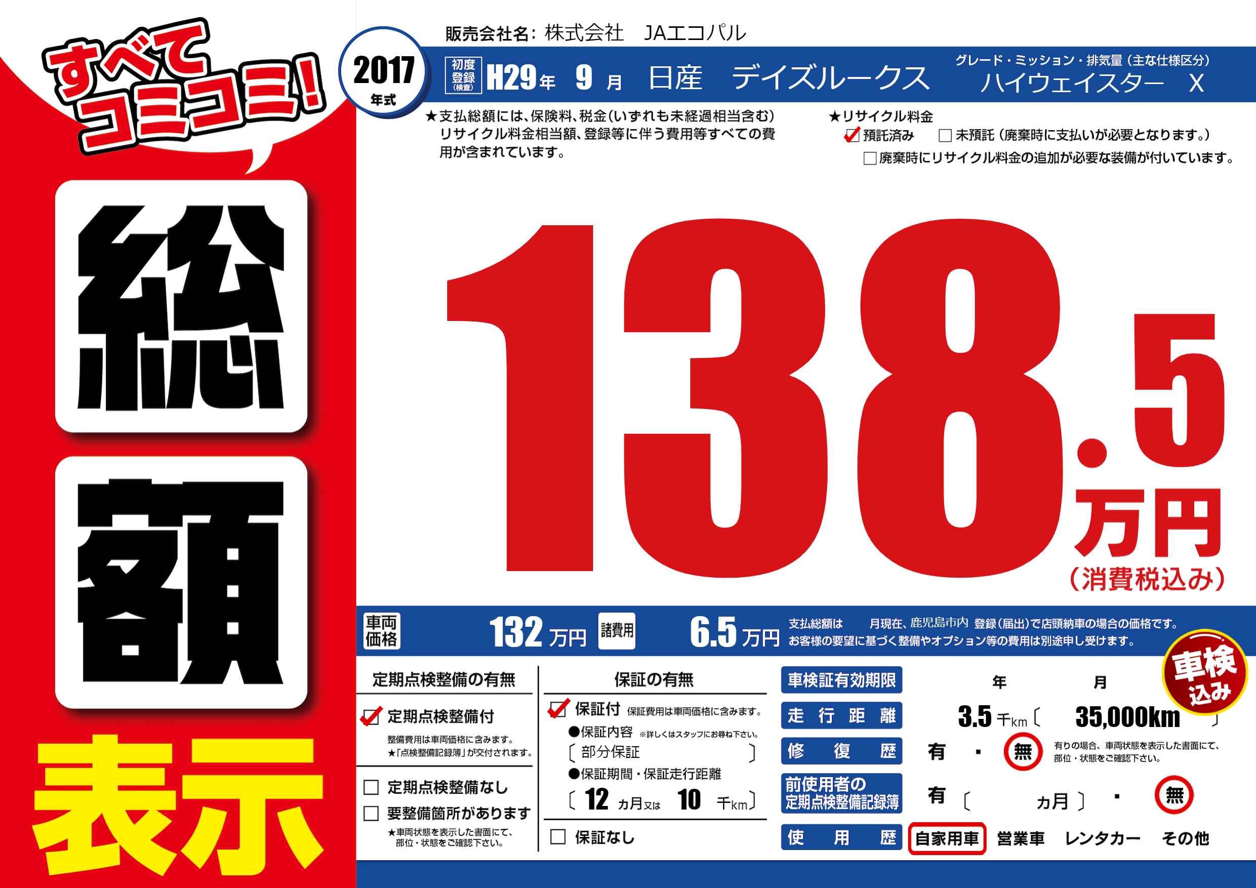 | 車名 | 日産 デイズルークス | グレード ミッション 排気量 |