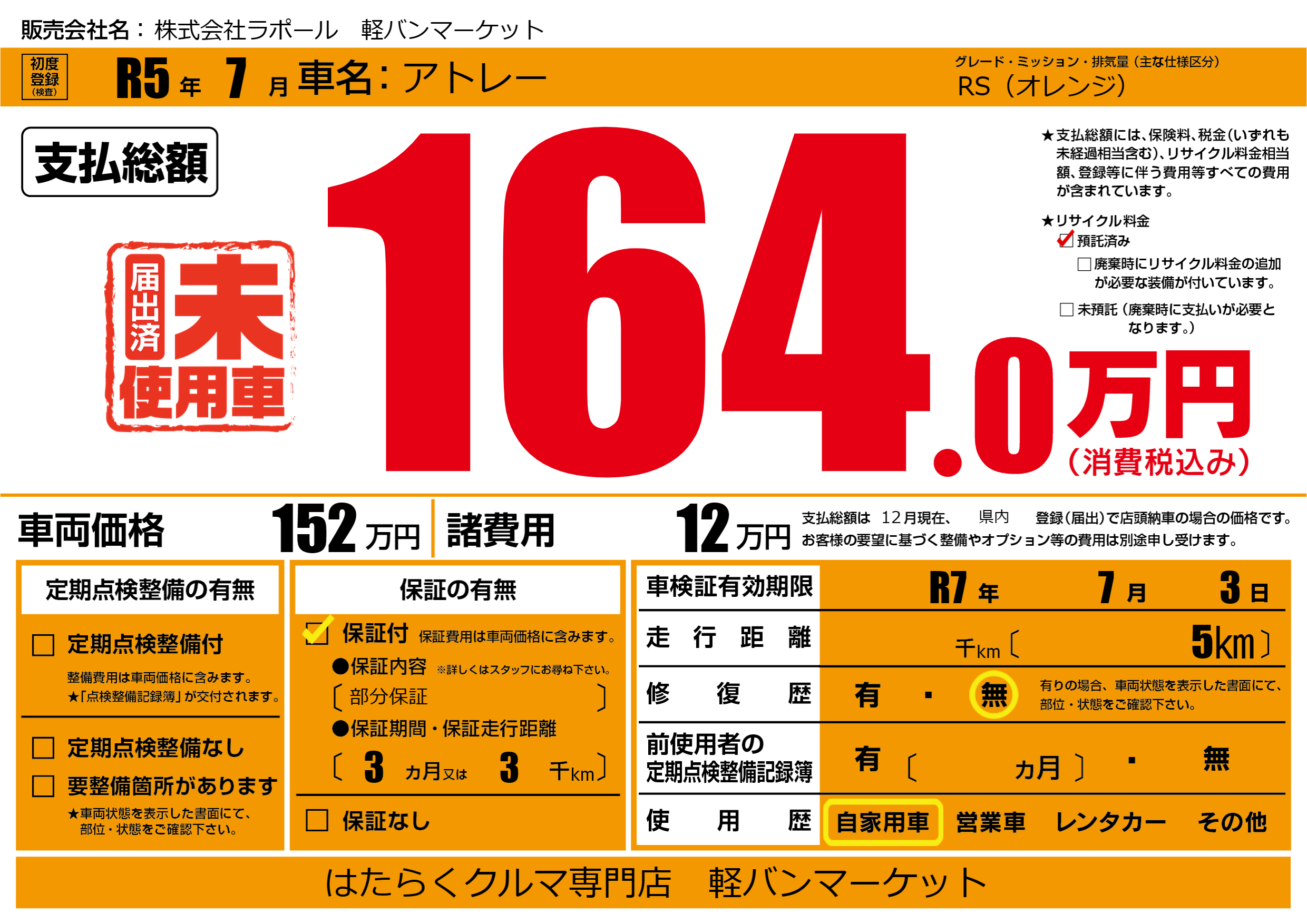 | 走行キロ | - | 初年度登録 | R5年7月 |