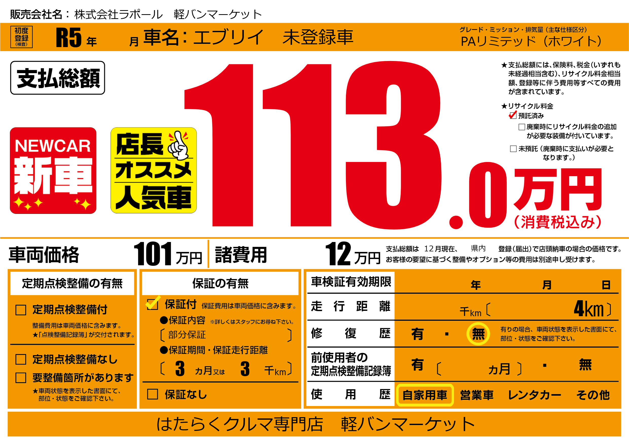 | 車名 | エブリイ 未登録車 | グレード ミッション 排気量 |