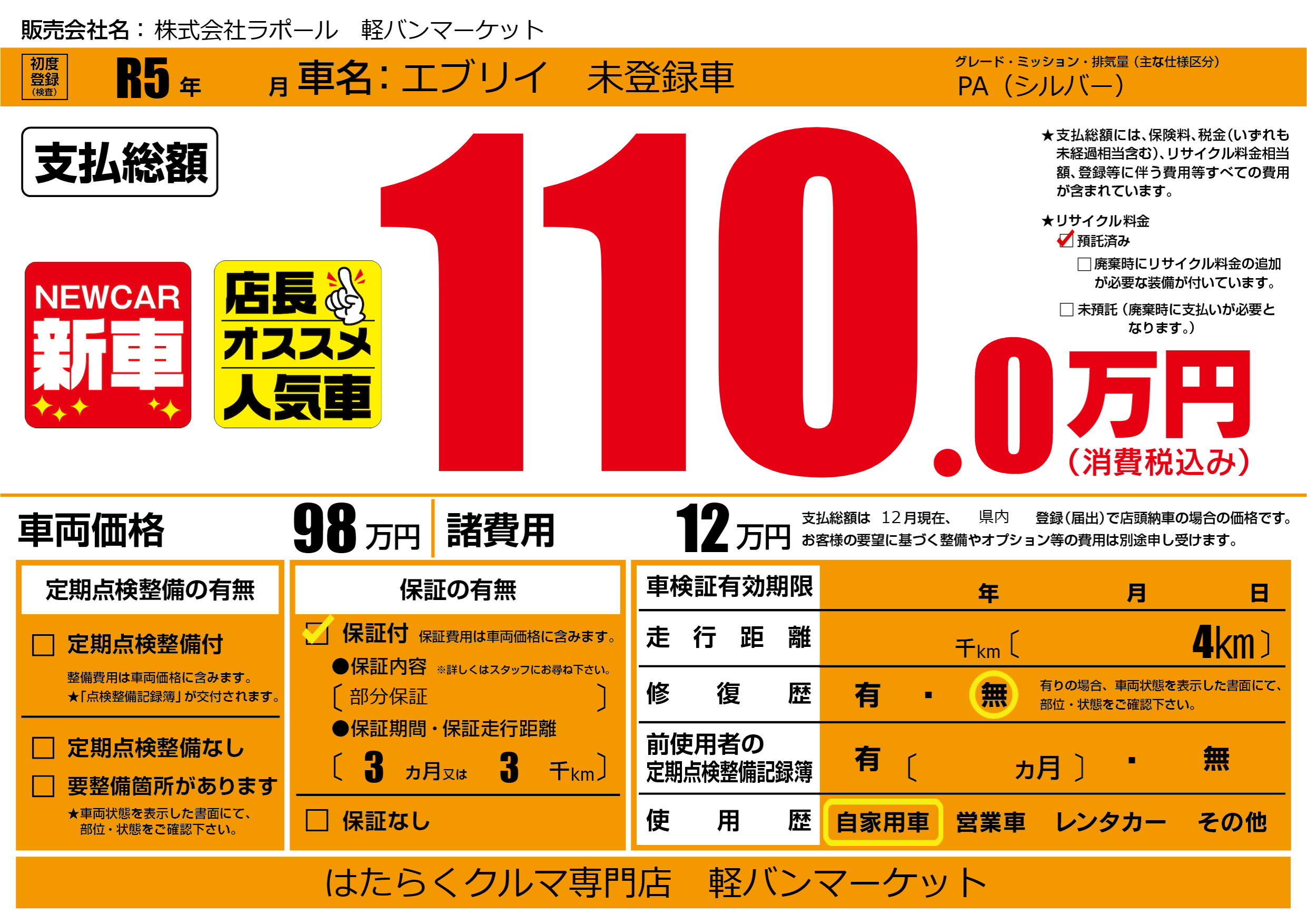 | 車名 | エブリイ 未登録車 | グレード ミッション 排気量 |