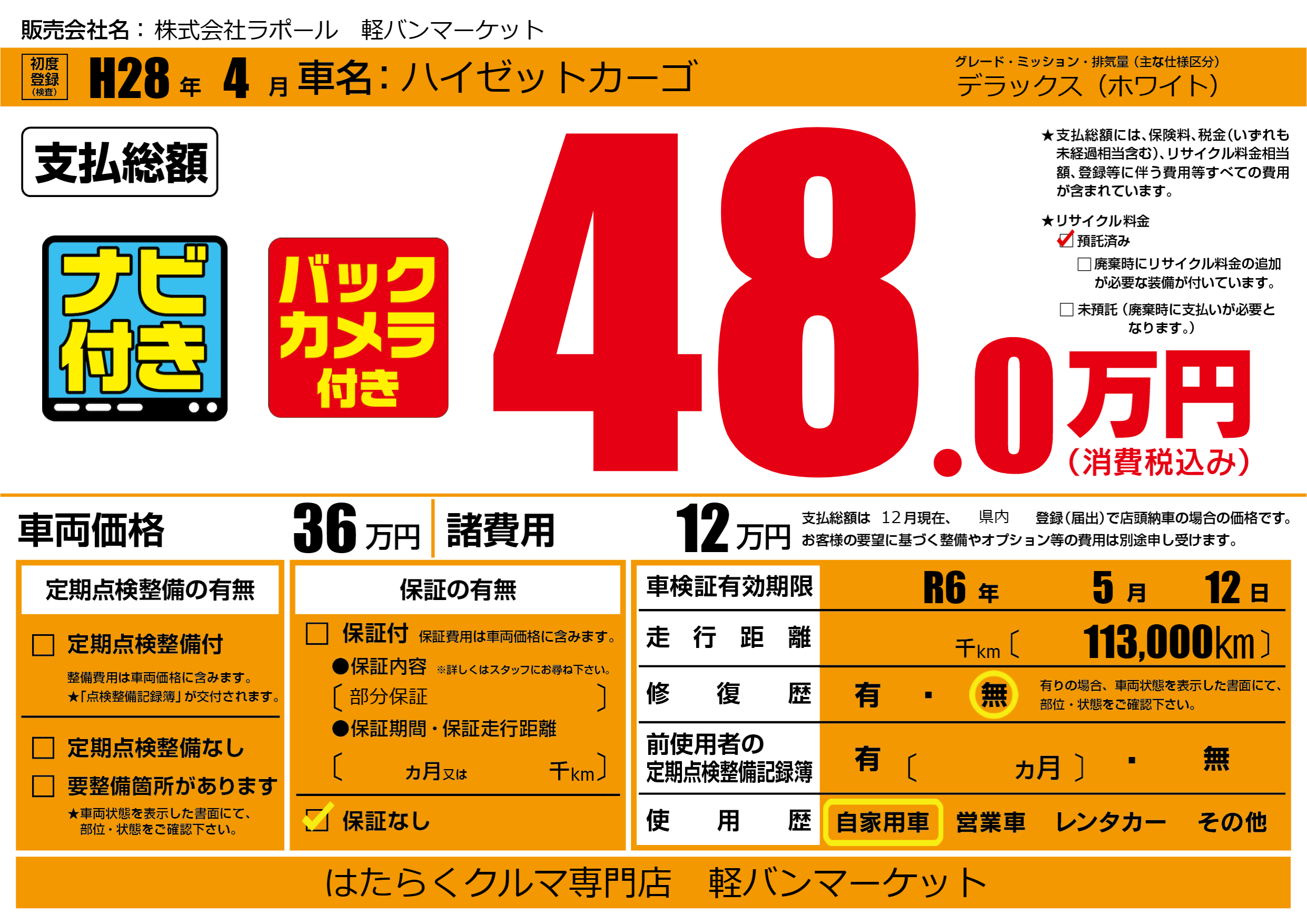 | 走行キロ | - | 初年度登録 | H28年4月 |