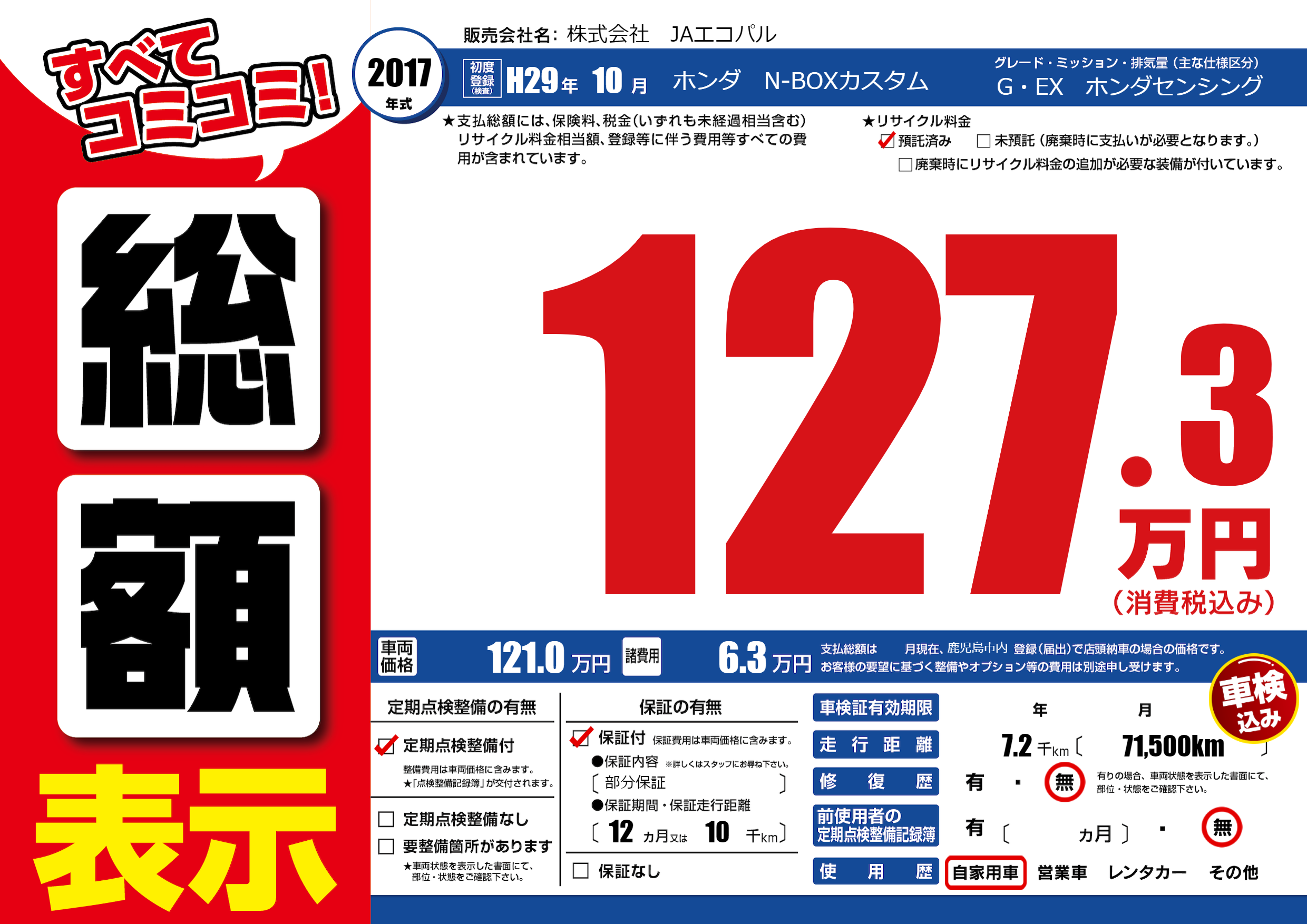 | 車名 | ホンダ N-BOXカスタム | グレード ミッション 排気量 |