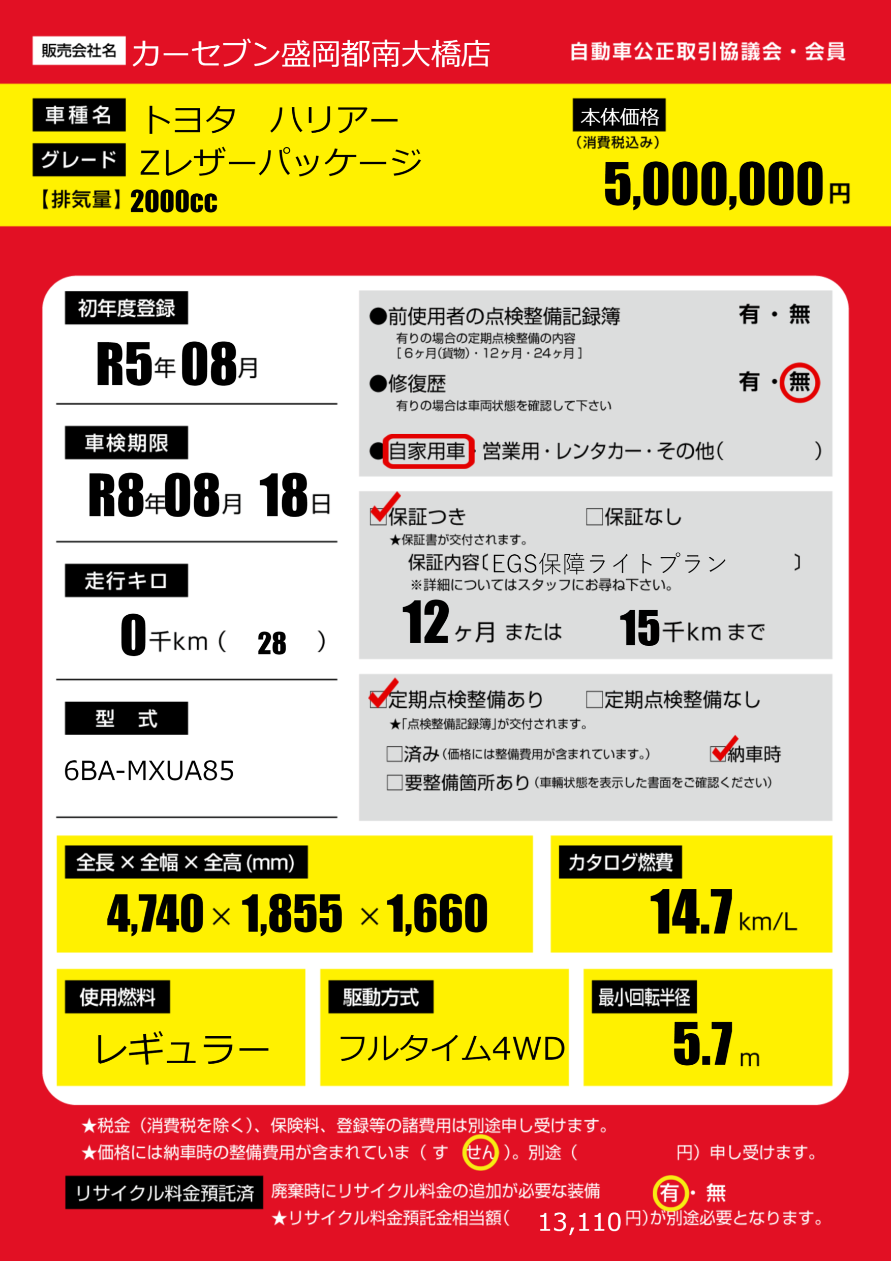 | 走行キロ | - | 初年度登録 | R5年08月 |
