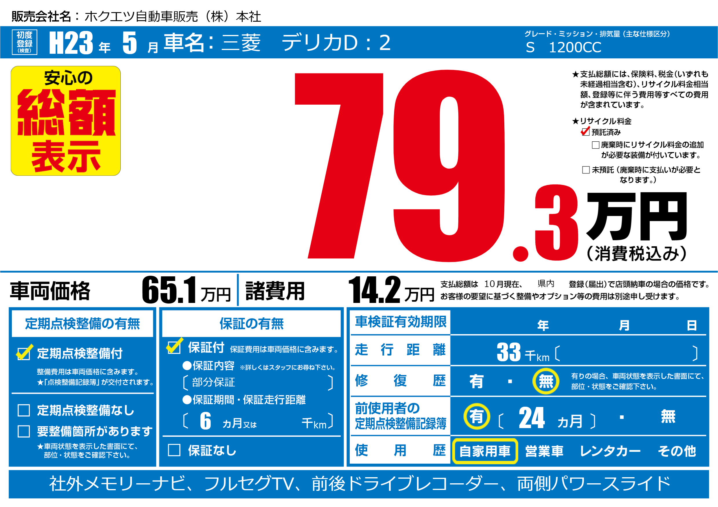 | 走行キロ | 3.3万km | 初年度登録 | H23年5月 |