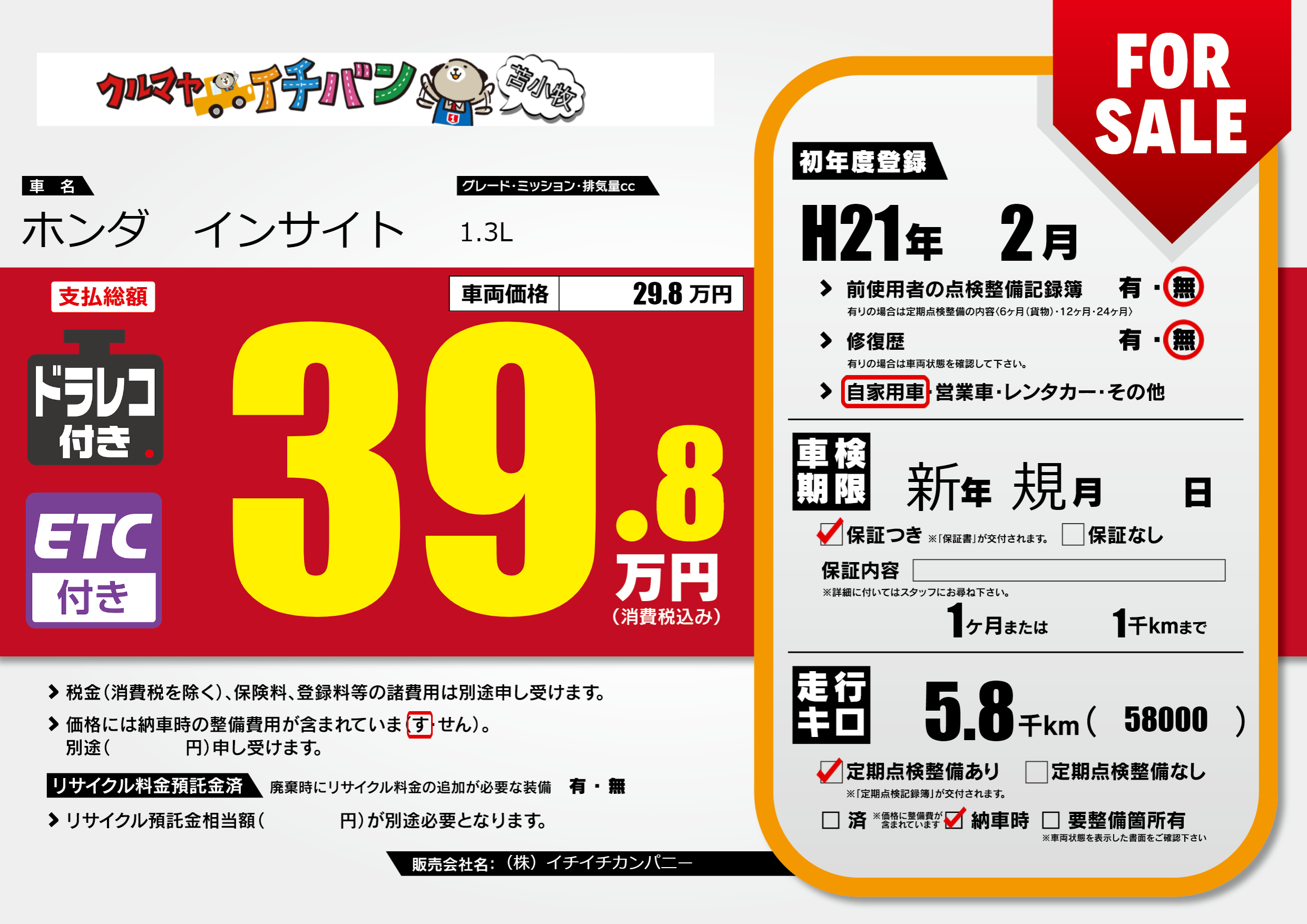 | 車名 | ホンダ インサイト | グレード ミッション 排気量 |