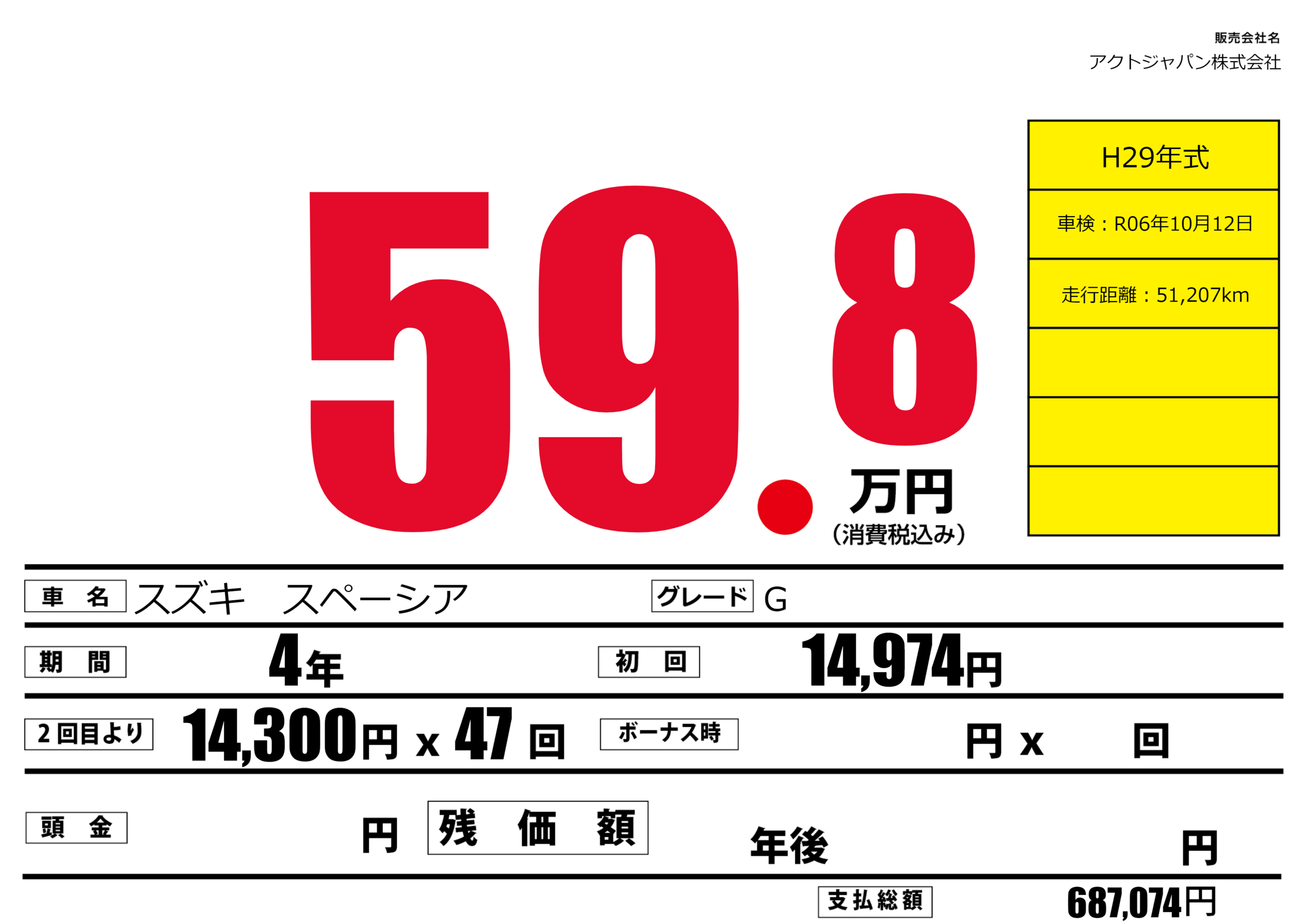 | 車名 | スズキ スペーシア | グレード ミッション 排気量 |