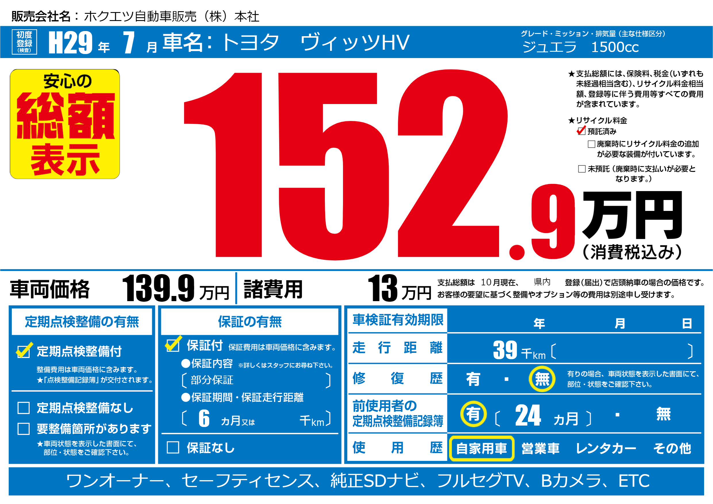 | 車名 | トヨタ ヴィッツHV | グレード ミッション 排気量 |