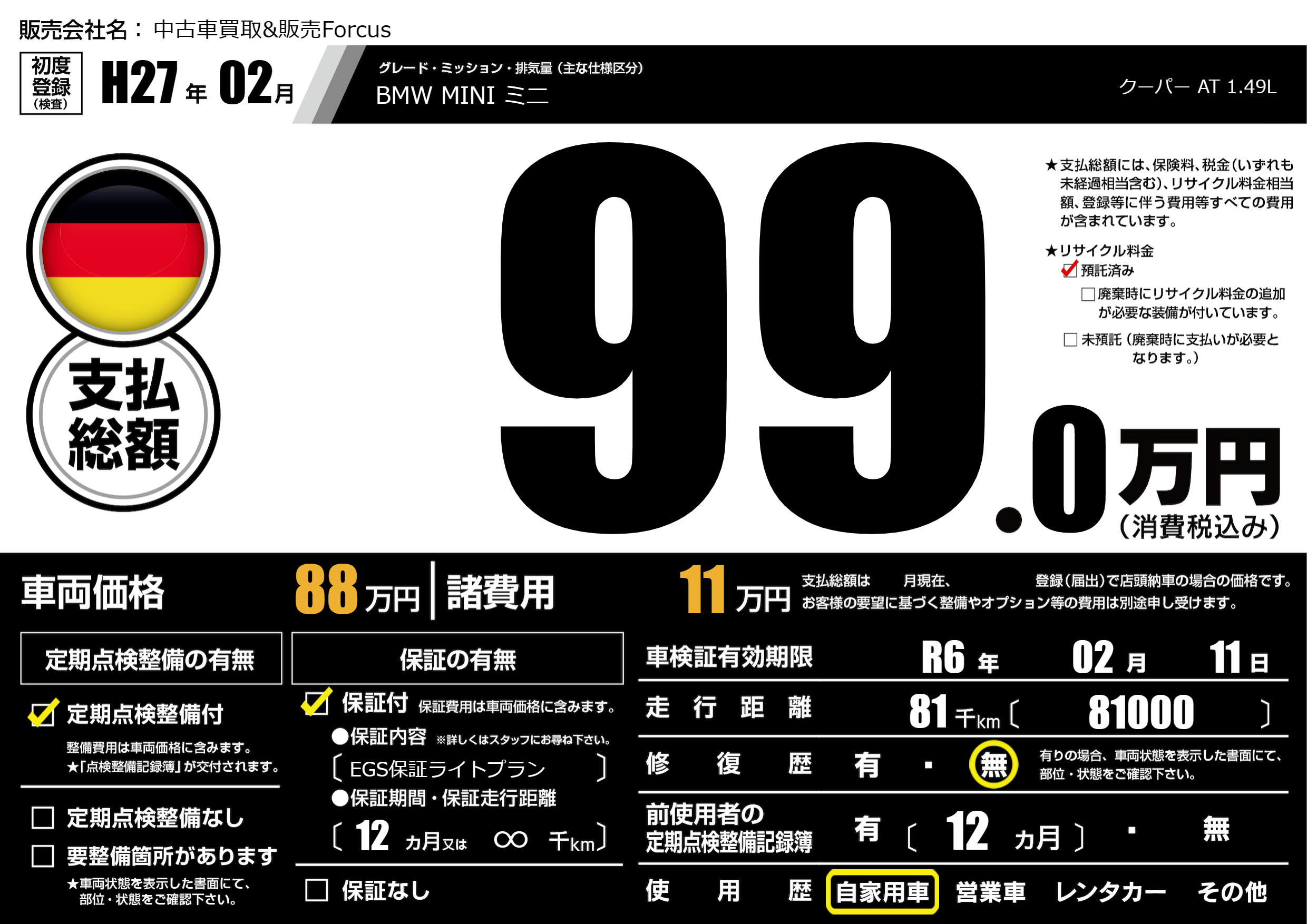 | 車名 | BMW MINI ミニ | グレード ミッション 排気量 |