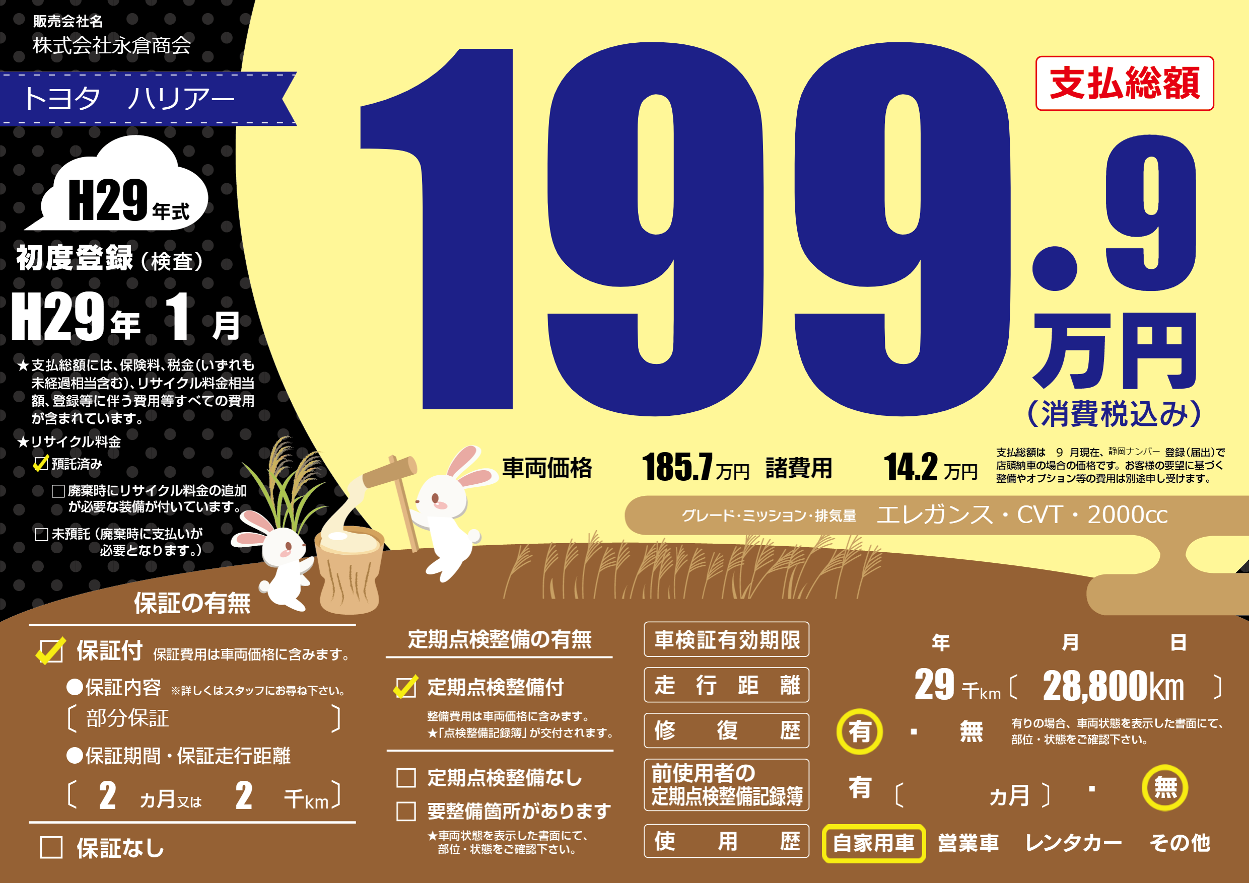 | 走行キロ | 2.9万km | 初年度登録 | H29年1月 |
