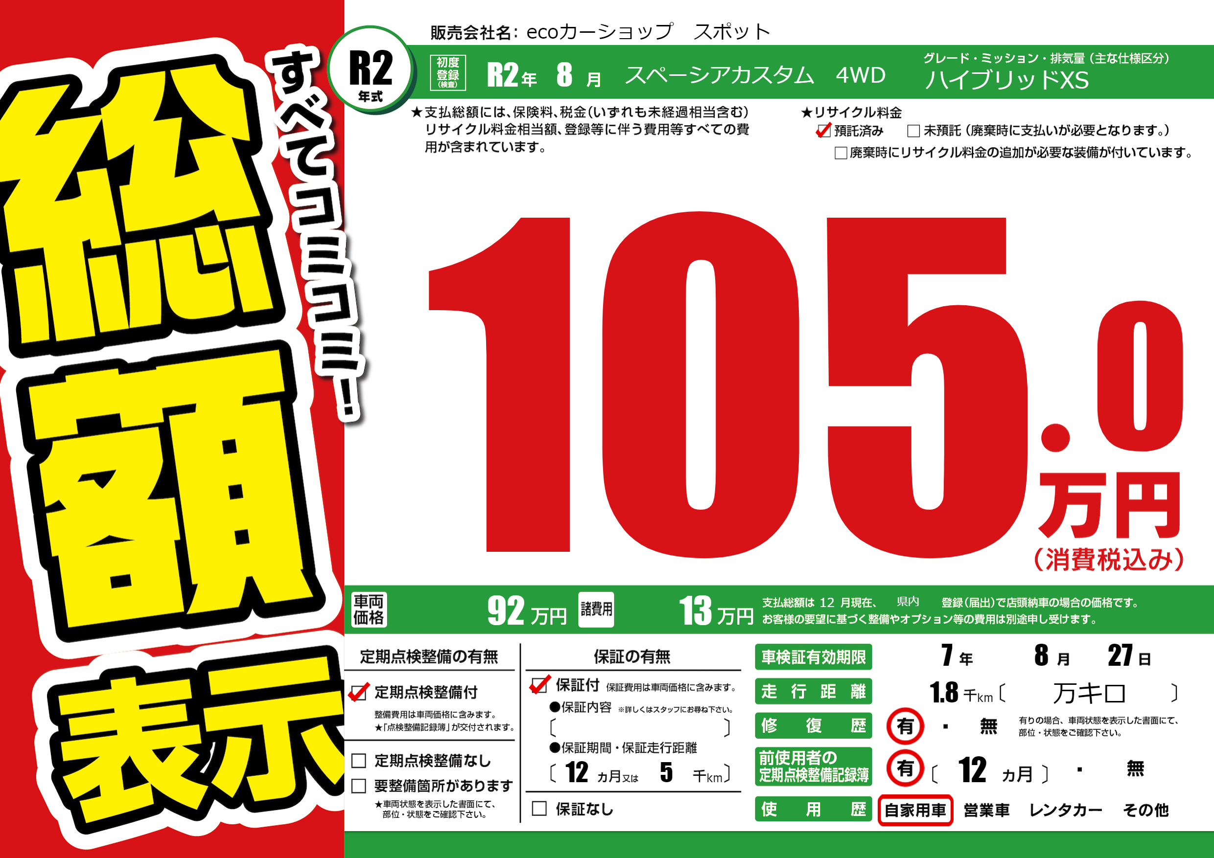 | 車名 | スペーシアカスタム 4WD | グレード ミッション 排気量 |
