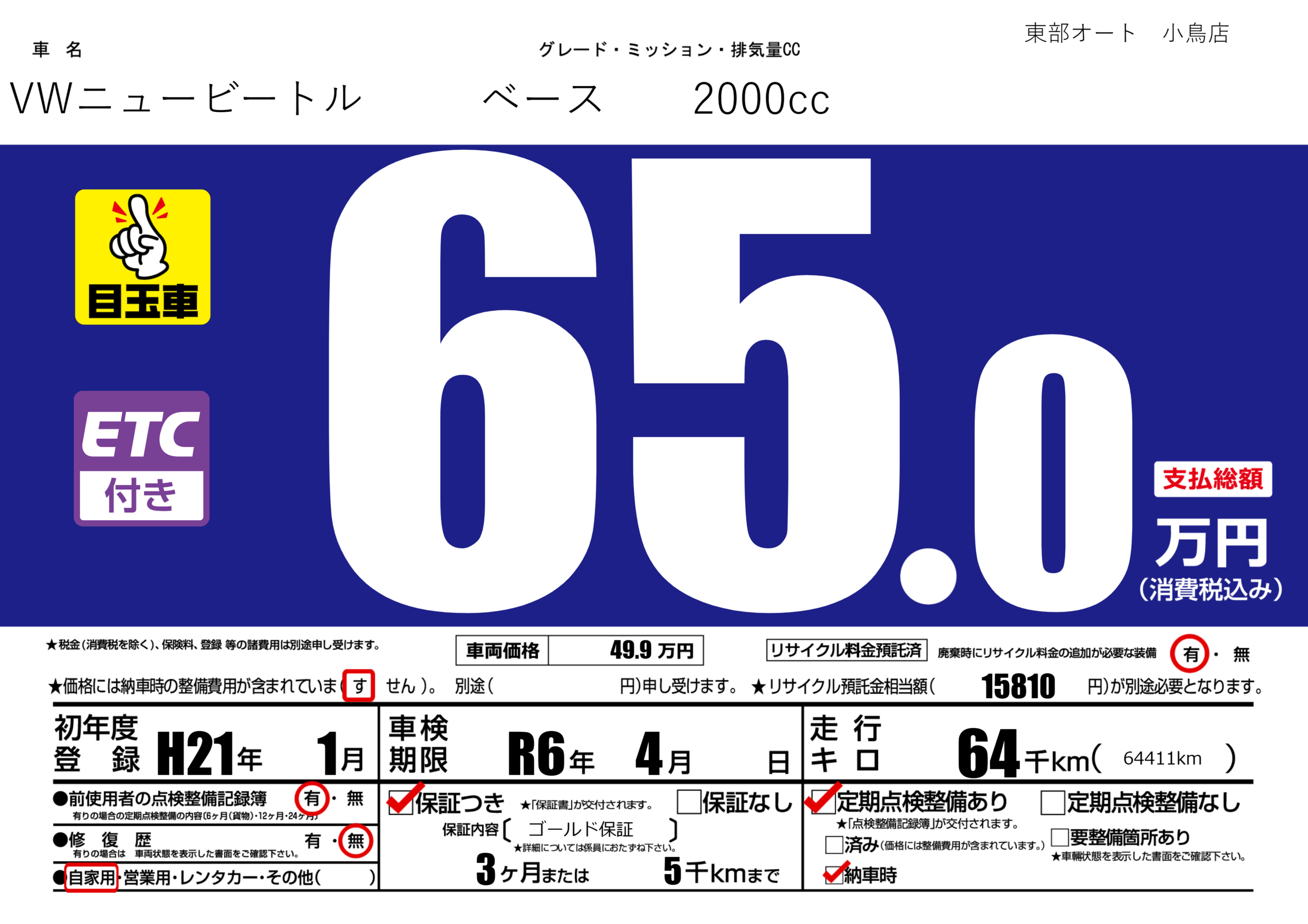 保証付き 保証内容( ゴールド保証) 3ヶ月または5千km |