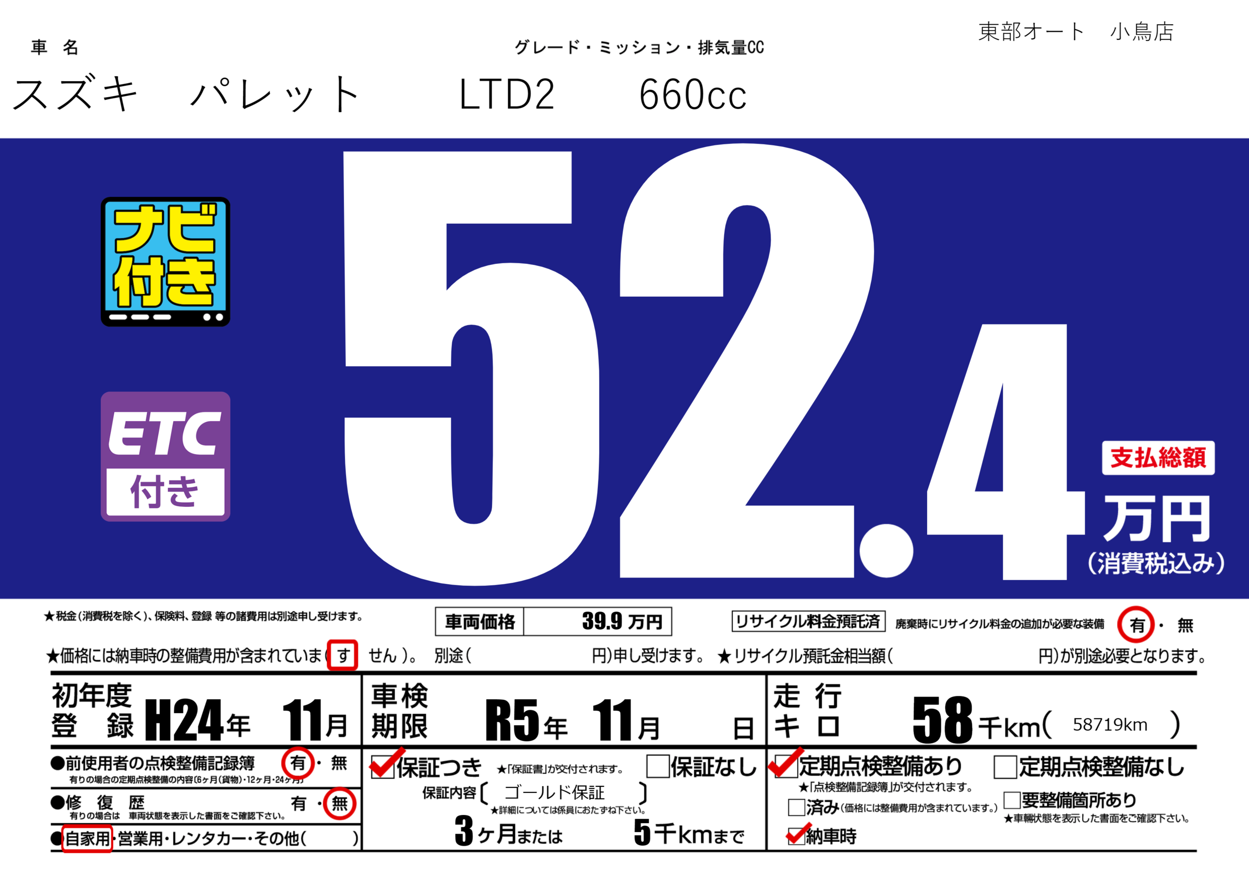 | 車名 | スズキ パレット | グレード ミッション 排気量 |