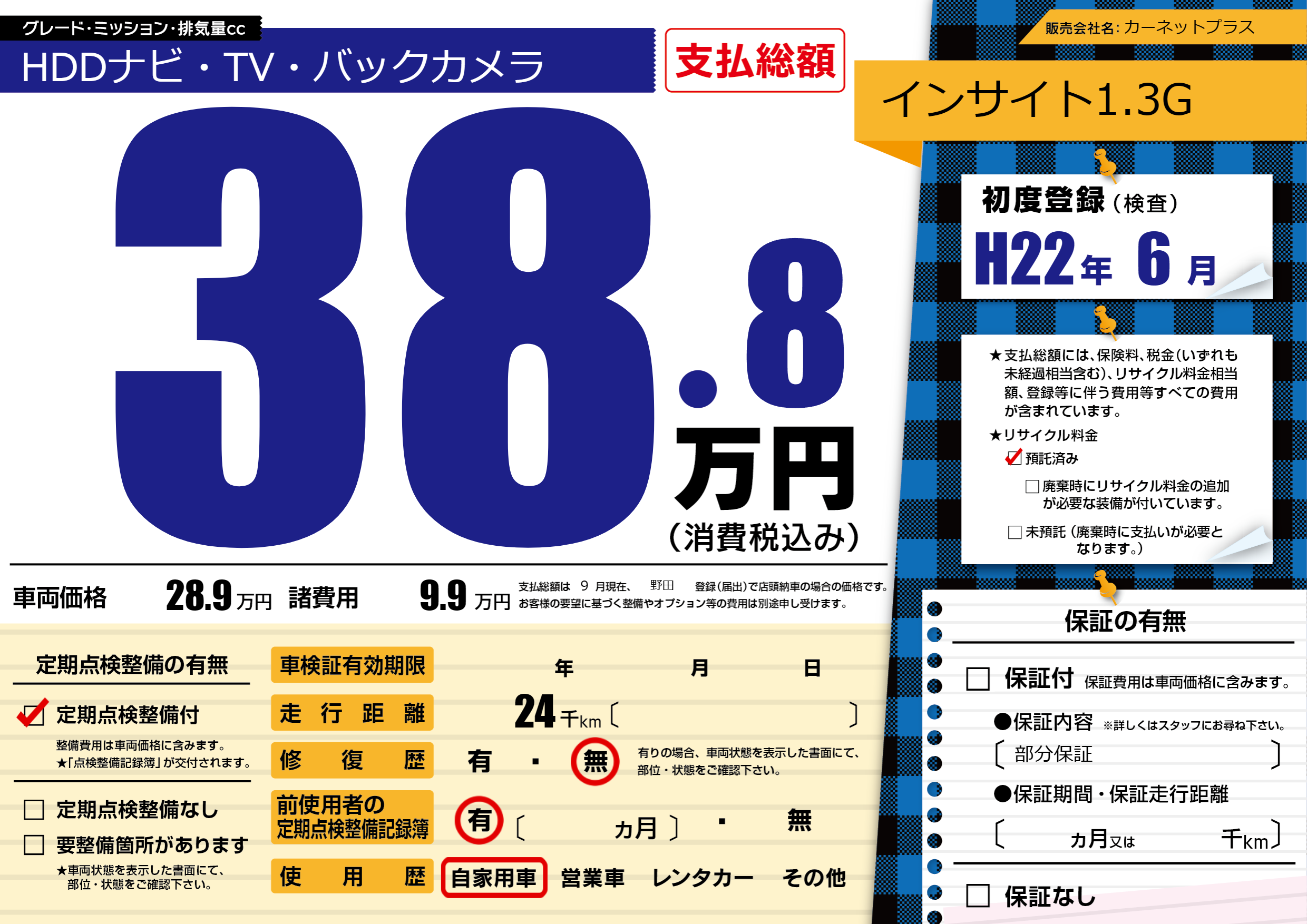 | 車名 | インサイト1.3G | グレード ミッション 排気量 |