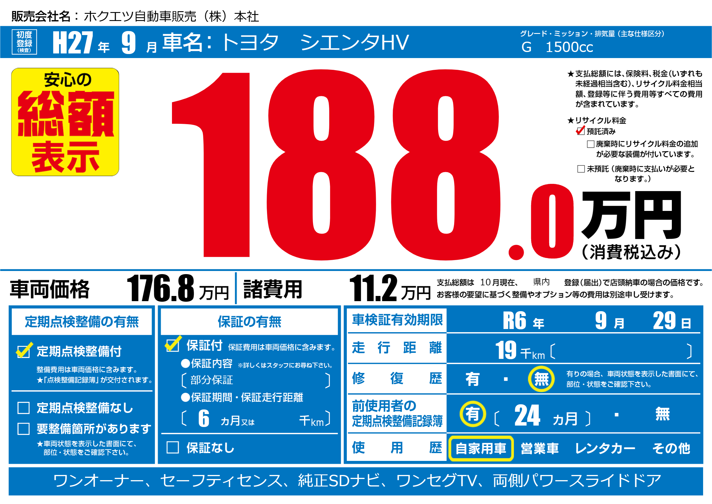 | 車名 | トヨタ シエンタHV | グレード ミッション 排気量 |