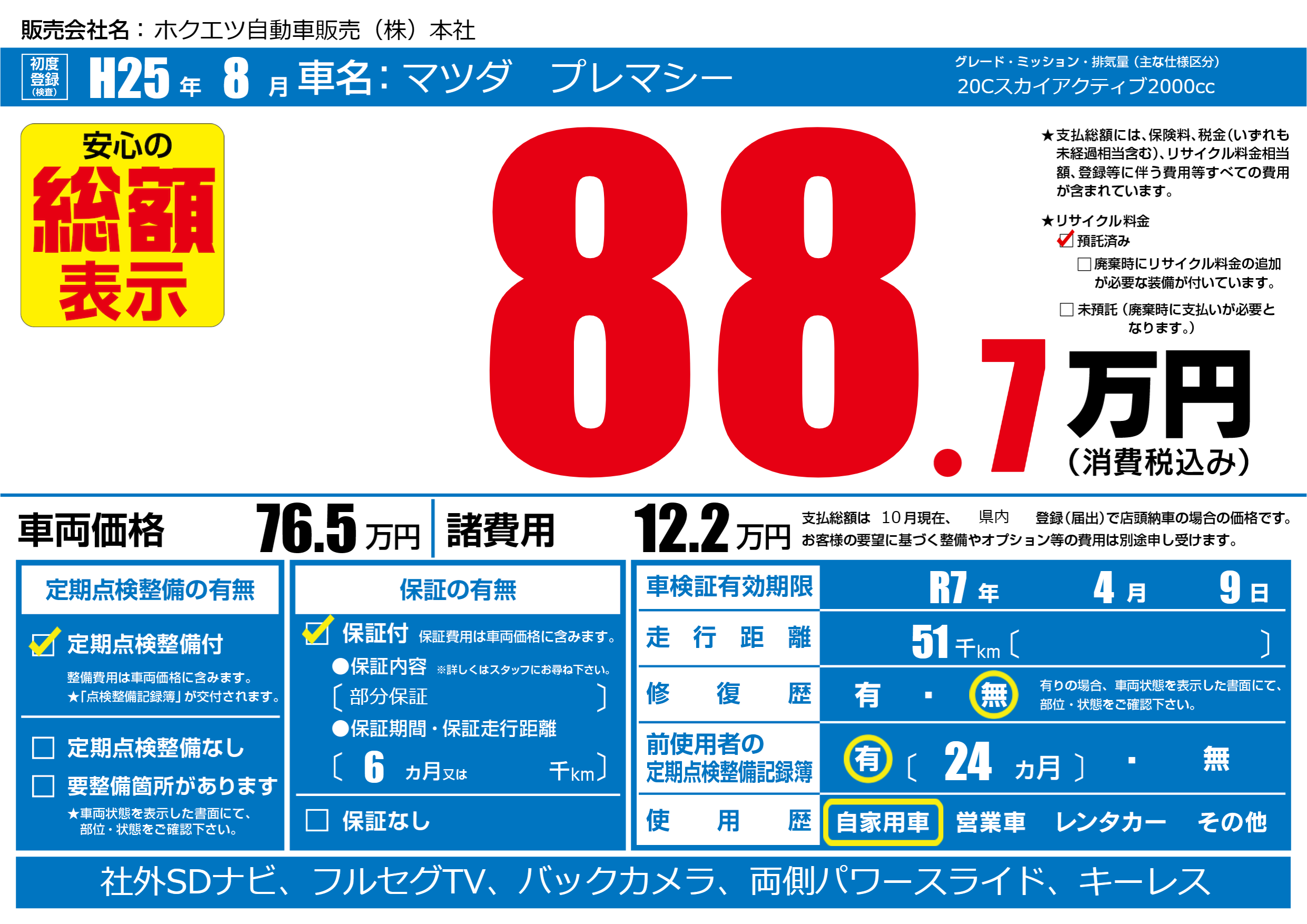 | 走行キロ | 5.1万km | 初年度登録 | H25年8月 |