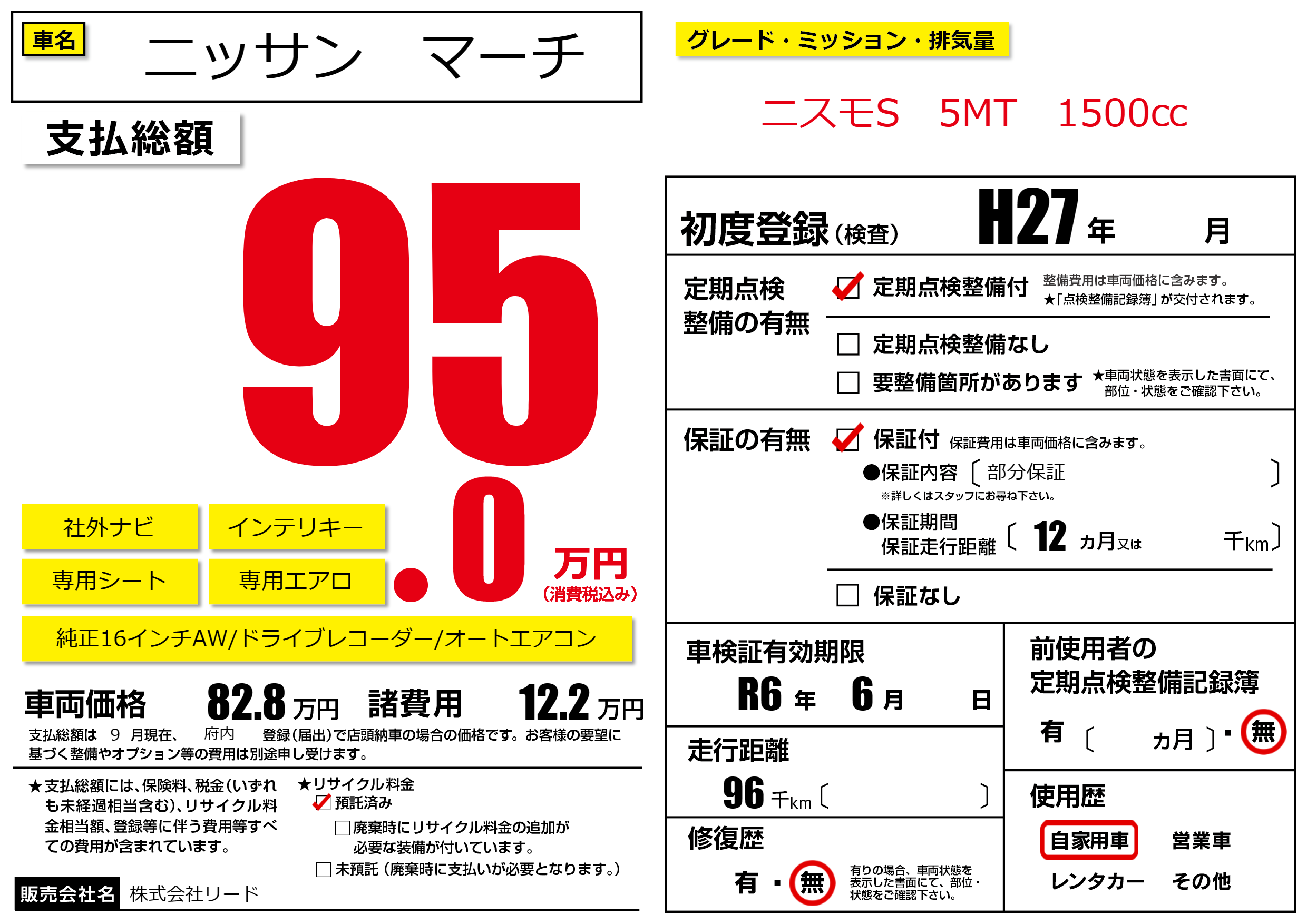 | 車名 | ニッサン マーチ | グレード ミッション 排気量 |
