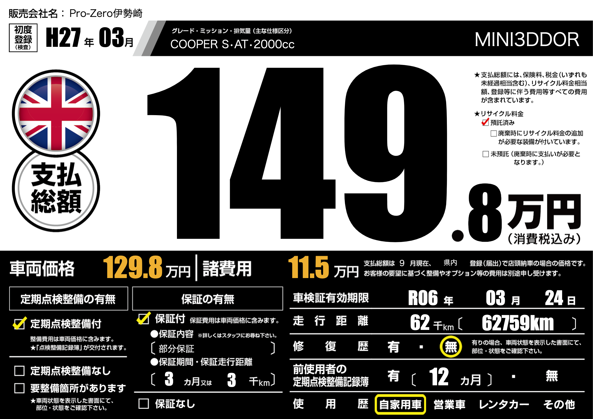| 車名 | COOPER S•AT•2000cc | グレード ミッション 排気量 |