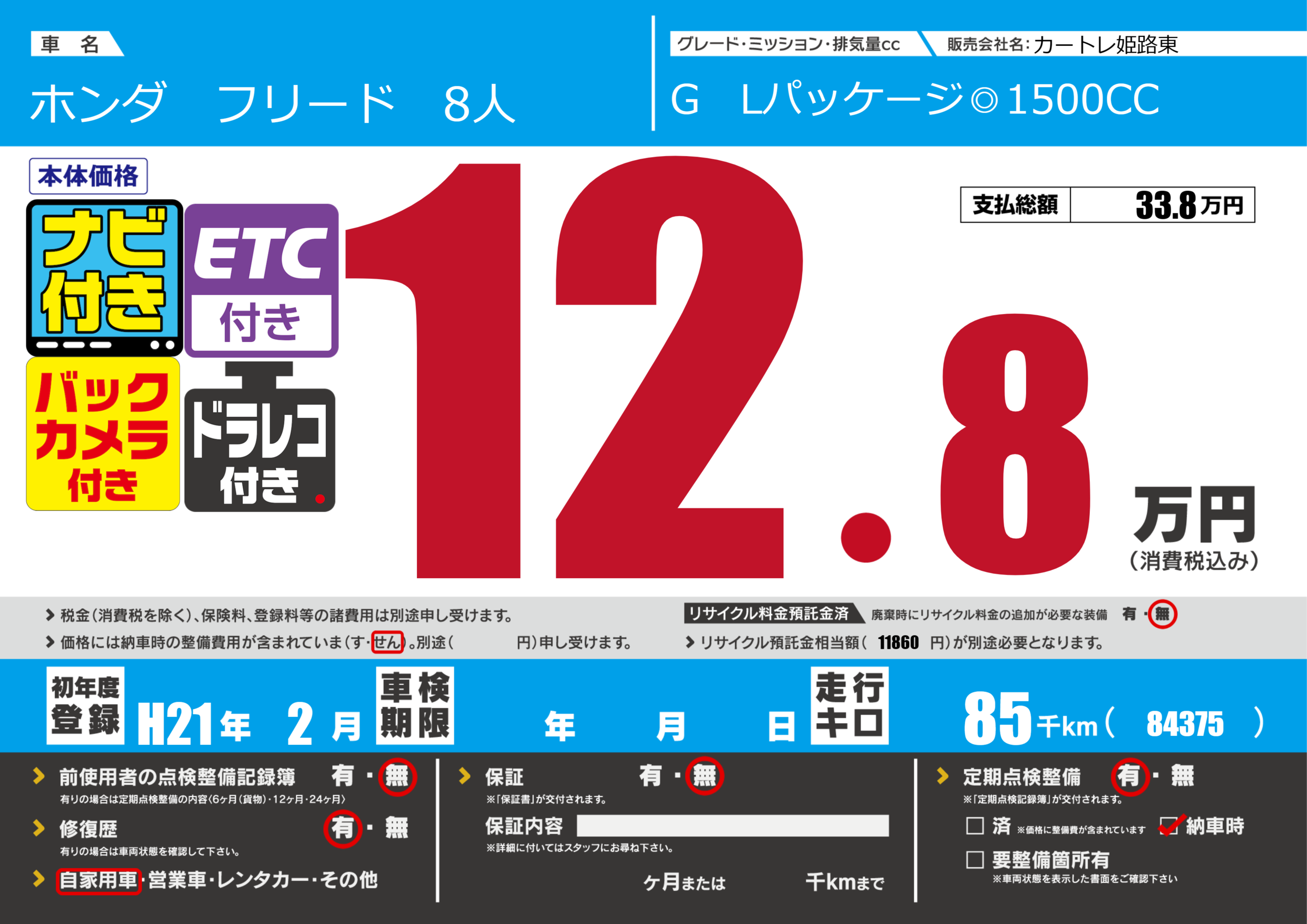 | 車名 | ホンダ フリード 8人 | グレード ミッション 排気量 |