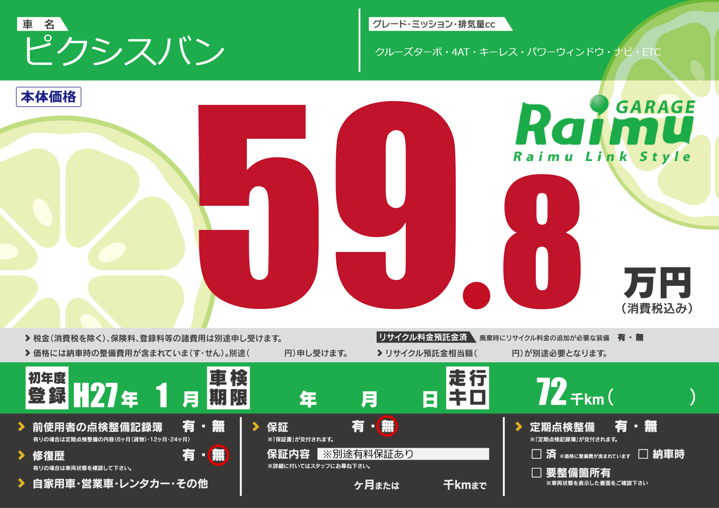 保証なし 保証内容(※別途有料保証あり) ---ヶ月または()千kmまで |