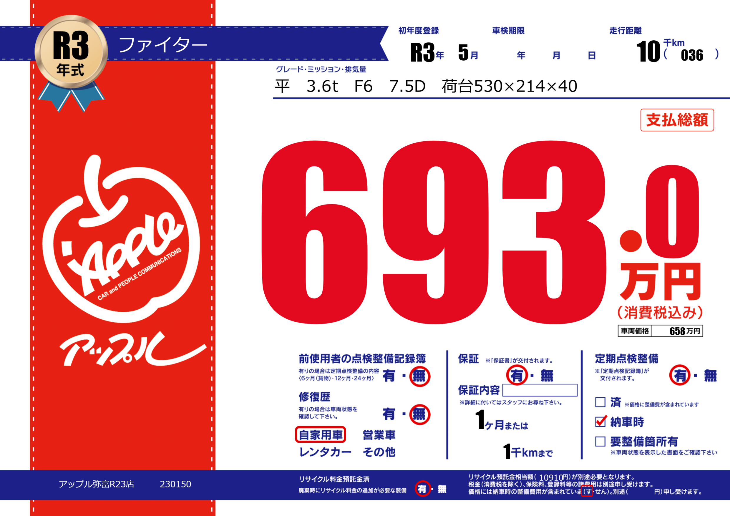 | 走行キロ | 1万km | 初年度登録 | R3年5月 |