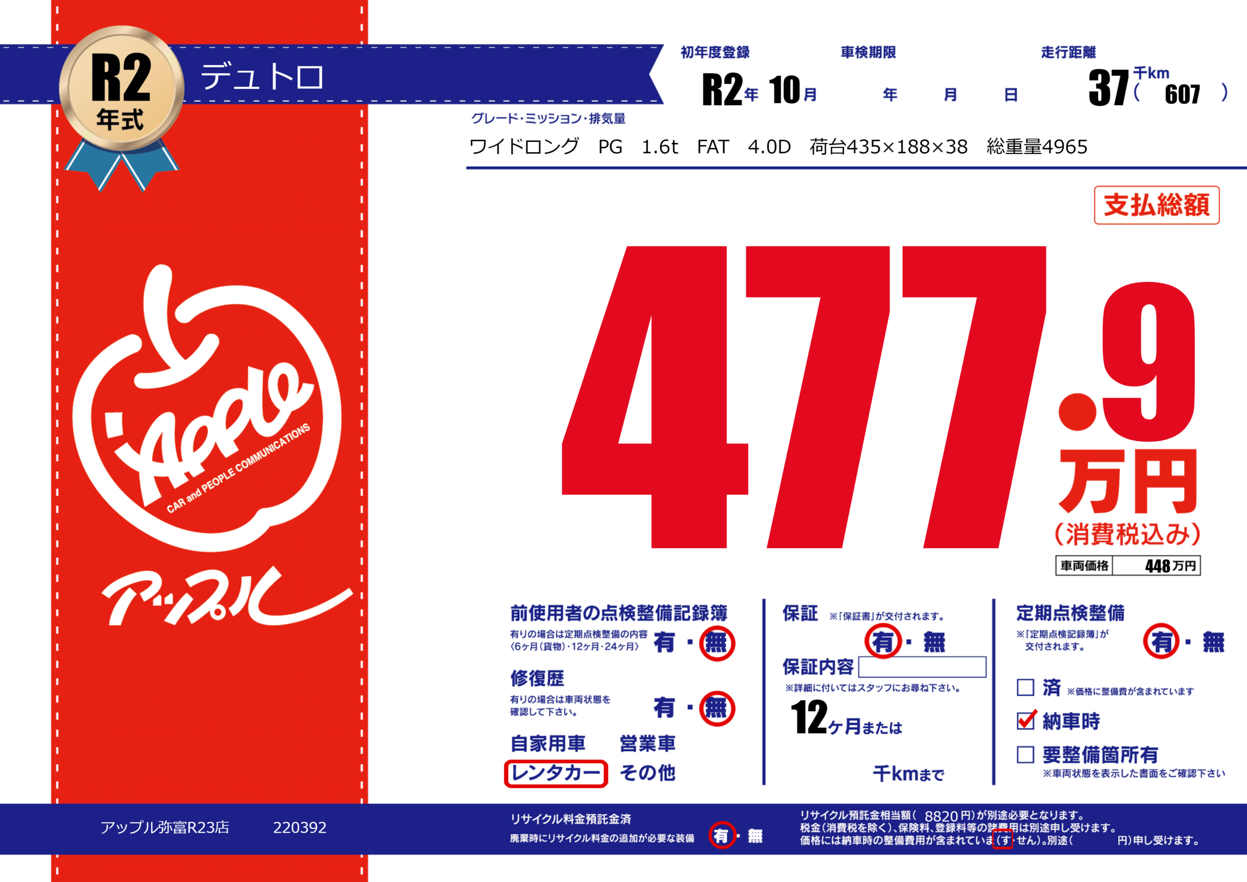 | 走行キロ | 3.7万km | 初年度登録 | R2年10月 |
